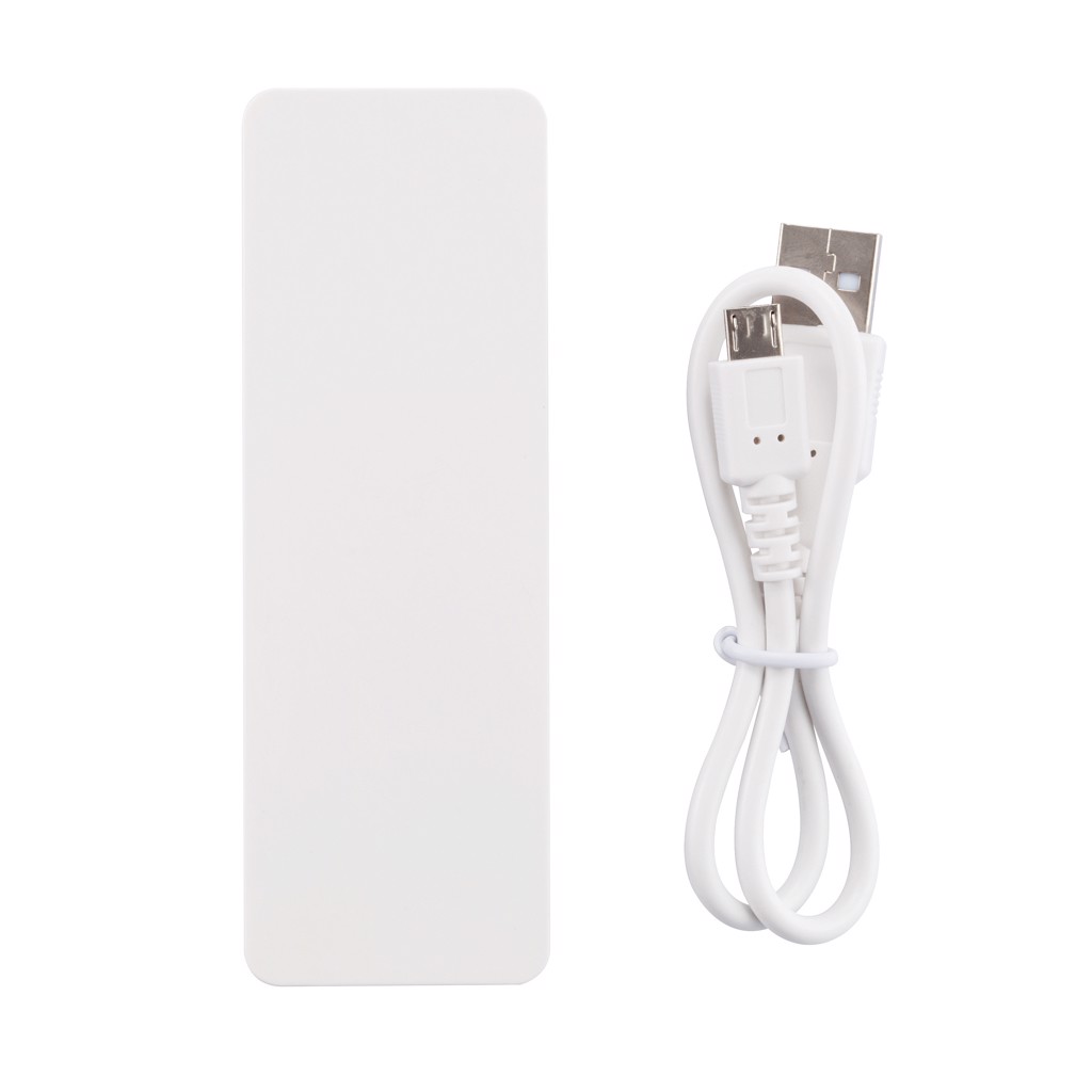 Flat and compact ABS powerbank with 2500mAh lithium battery. Output 5V/1A and input 5V/800 mA. Including micro USB cable.