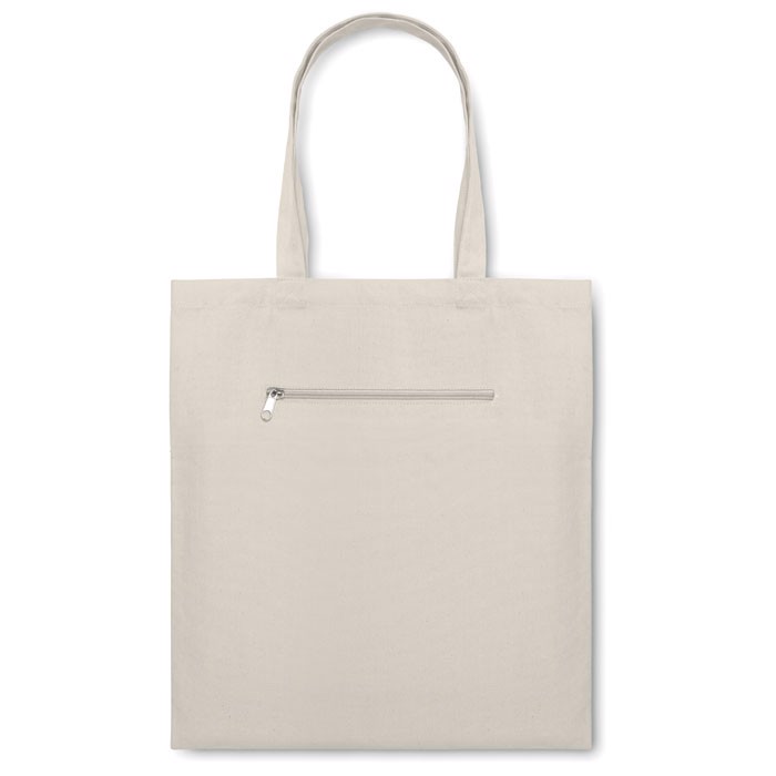 Canvas shopping bag with short handles and front zipped pocket. 280 gr/m². Produced under a certified standard for the use of harmful substances in textile.