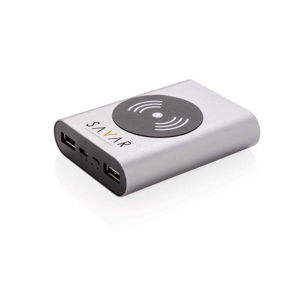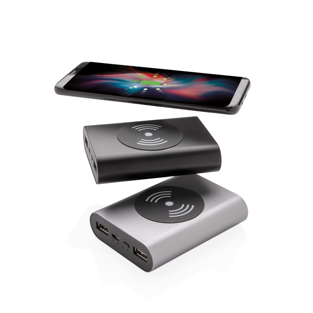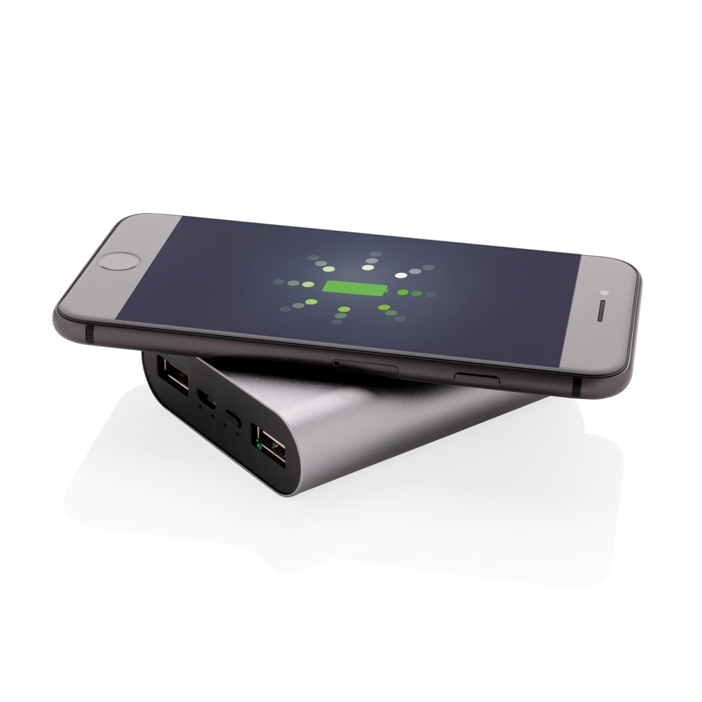 Pocket size 5.000 mAh powerbank made out of aluminium. Supports 5W wireless charging and comes with two USB ports to also enable charging by cable. When fully charged it will provide you with enough energy to re-charge your mobile phone up to three times. The powerbank contains a long lasting grade A 5.000 mAh high-density lithium polymer battery. The power indicators will indicate the remaining energy level so you always know when to re-charge. Micro USB port-in: 5V/1.5A Output: 5V/2.1A. Wireless output 5W 5V/1A.