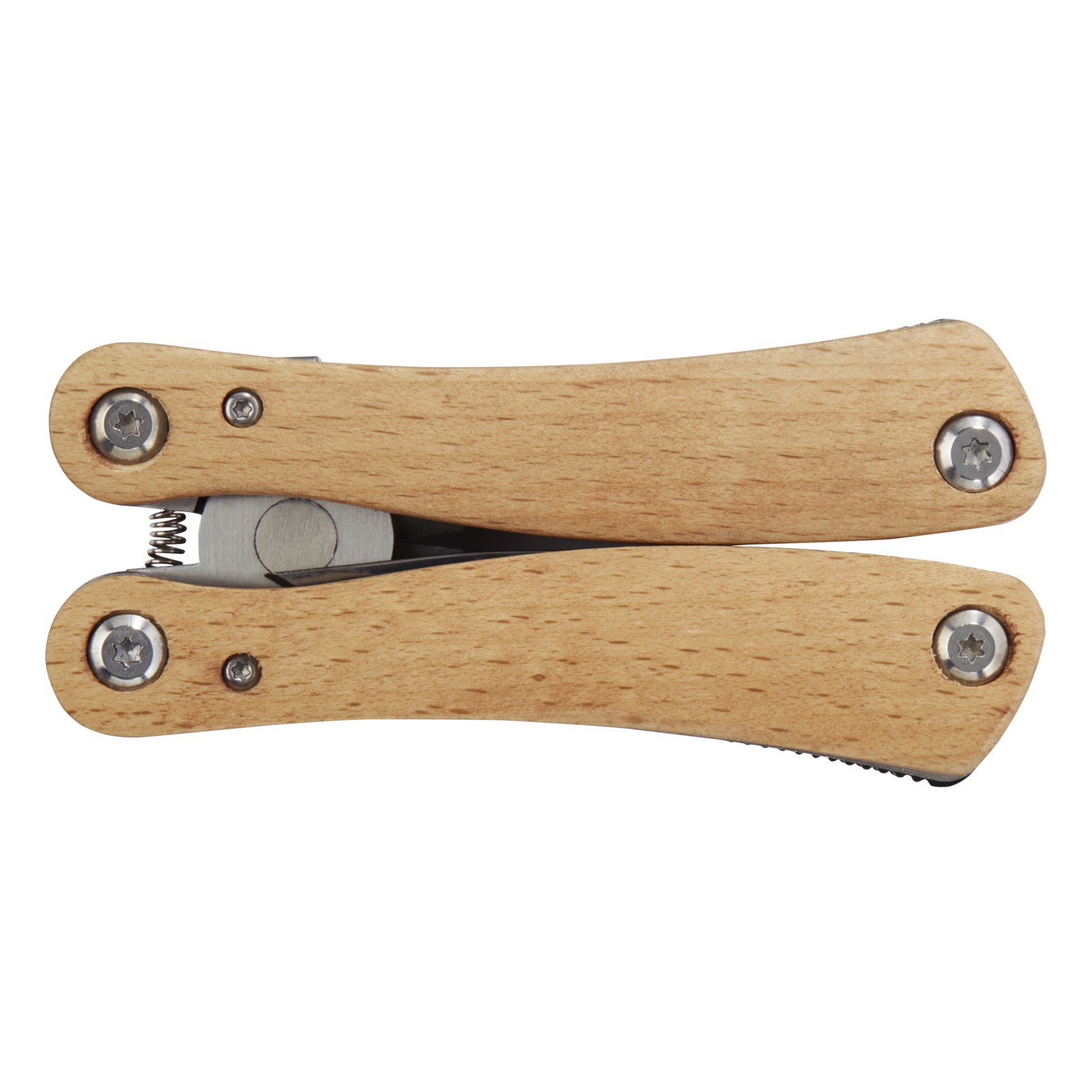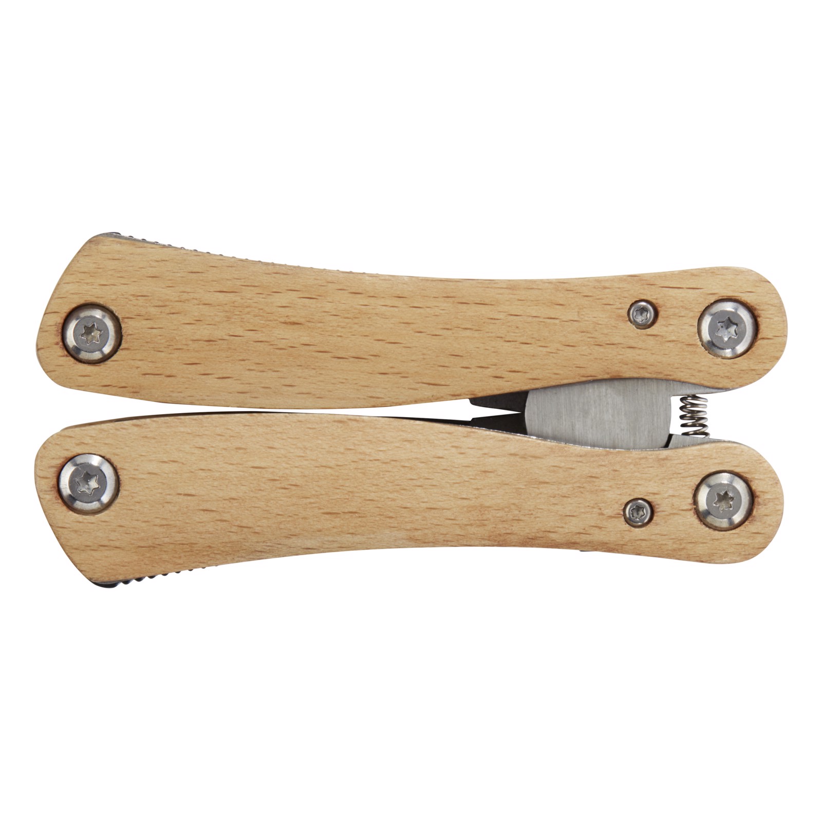 Strong and durable large multi-tool made from high quality stainless steel with handles made of beech wood. This is a must-have tool for any scout, handy man, and outdoor enthusiast. Includes 12 functions: large nose pliers, standard pliers, wire cutter, serrated blade, medium knife, philips screwdriver, bottle/can opener, flat screwdriver, medium flat screwdriver, saw and file, and file cleaner. The beech wood used is from sustainable, environmentally and socially responsible sources. The size when opened is 15 x 6.5 cm, and when closed 9.8 x 4,7 cm. Comes with an instruction manual and is packed in a recycled cardboard gift box with a size of 12 x 7 x 2.5 cm. Laser engraving is recommended as a sustainable decoration option.