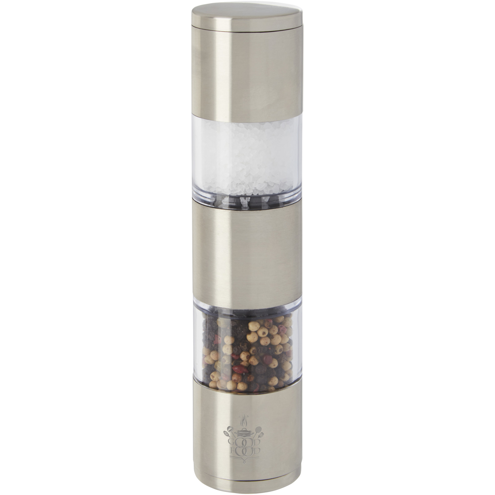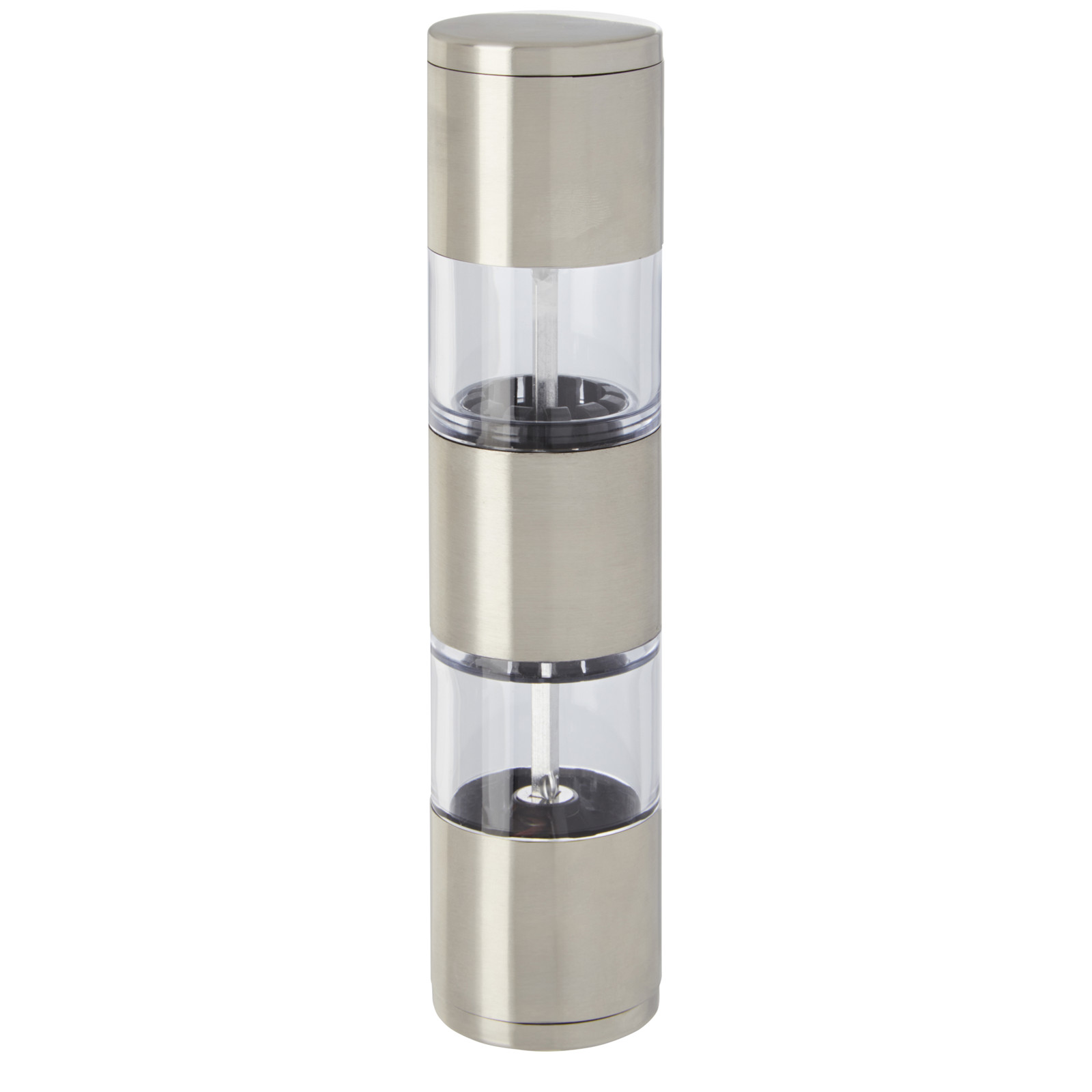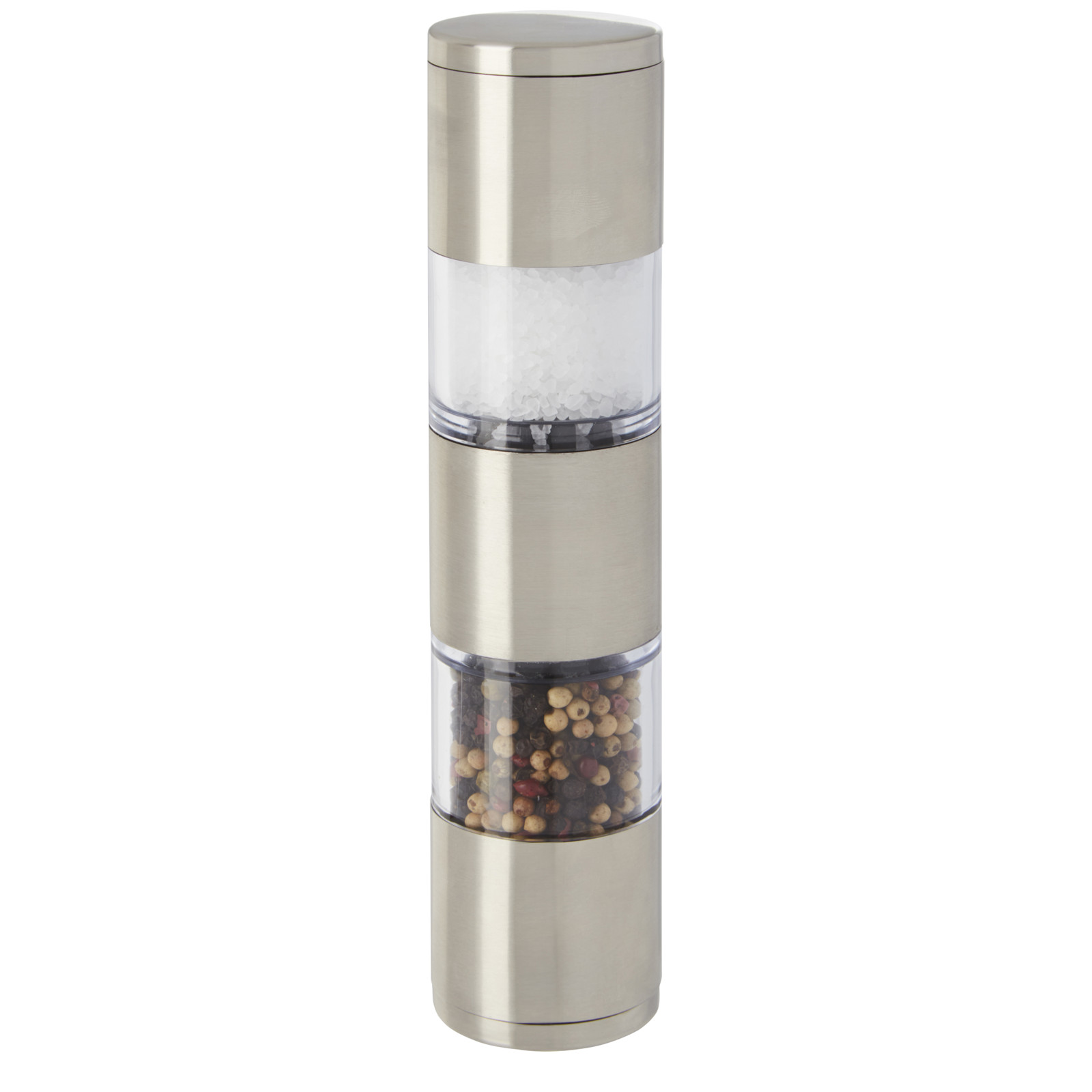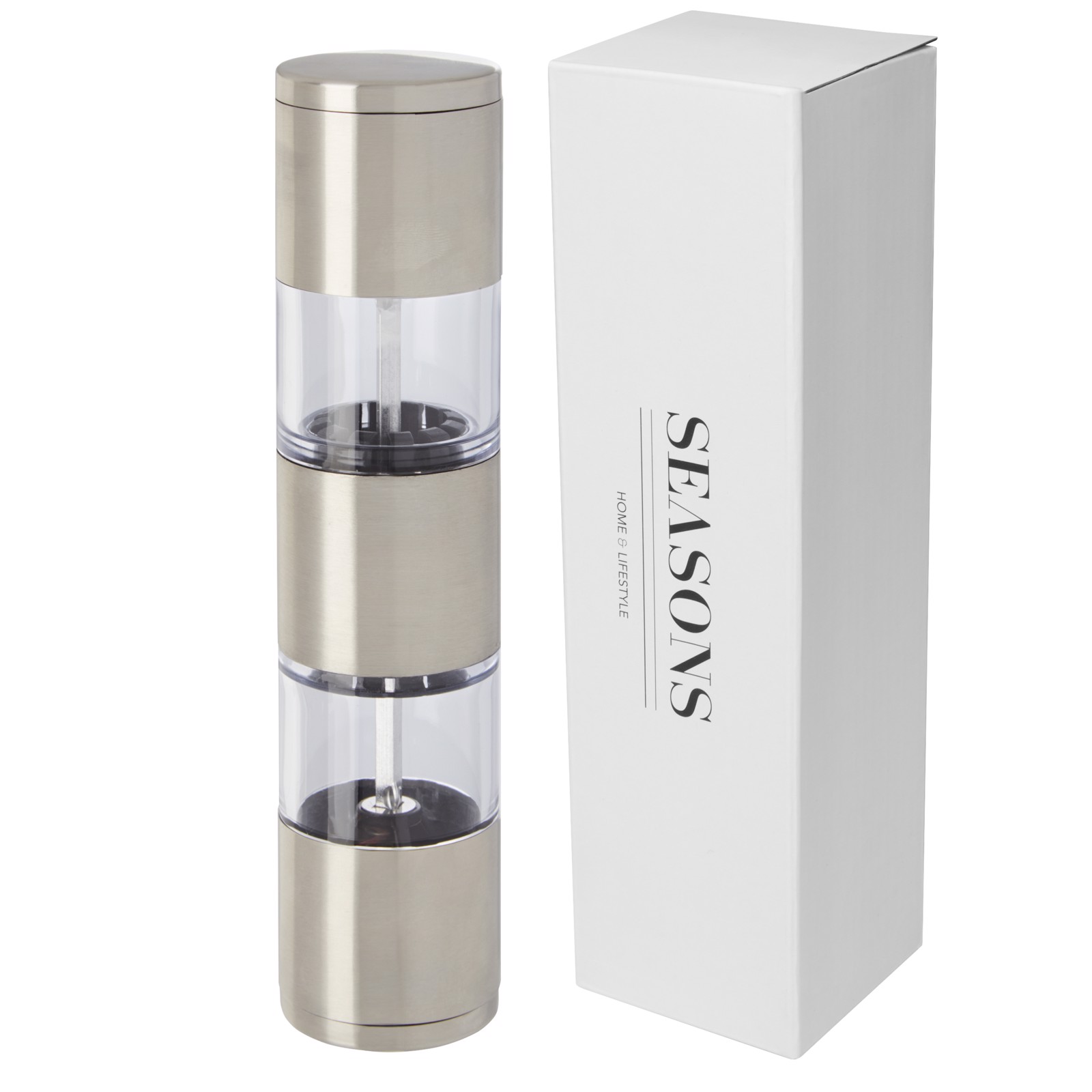 2-sided grinder with one end for salt and the other for pepper. Pepper and salt are not included.