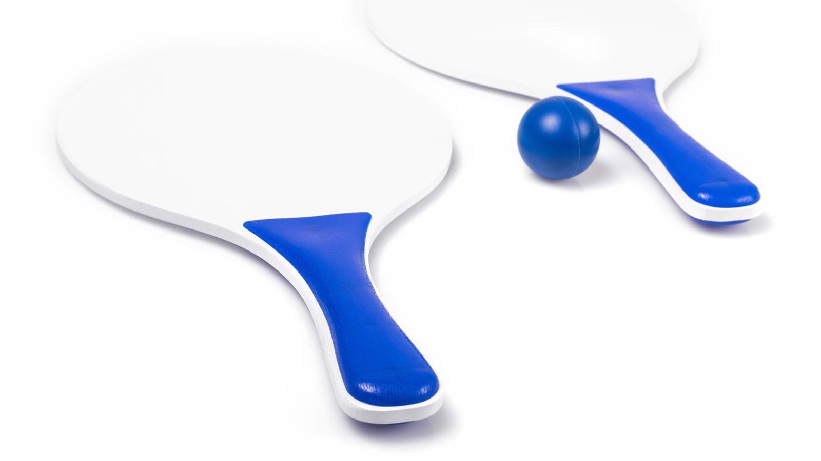 Pair of beach rackets in natural wood with reinforced handle in varied bright tones. Presented in a mesh bag with matching color ball.