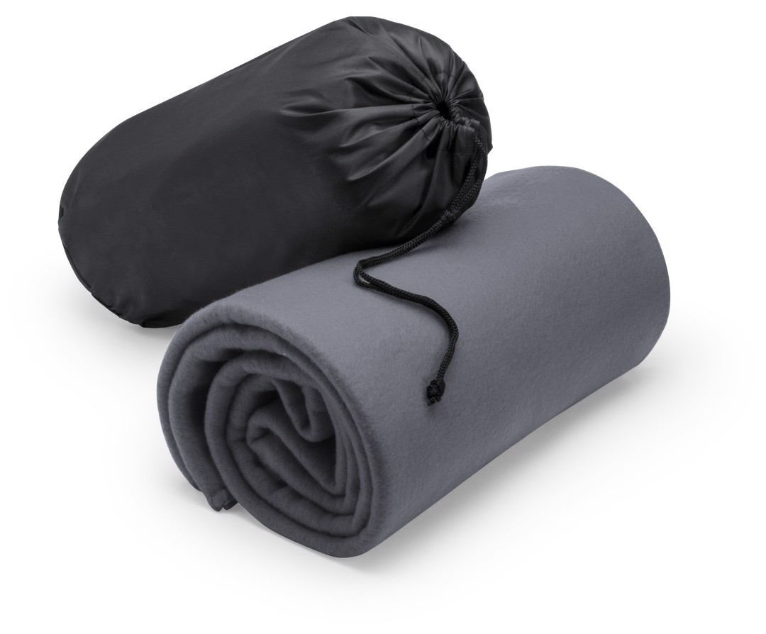Blanket of 120x150cm in a varied range of bright tones. In polar fleece material of 180g/m2 with anti-pilling treatment and with a soft polyester, string closure sleeve.