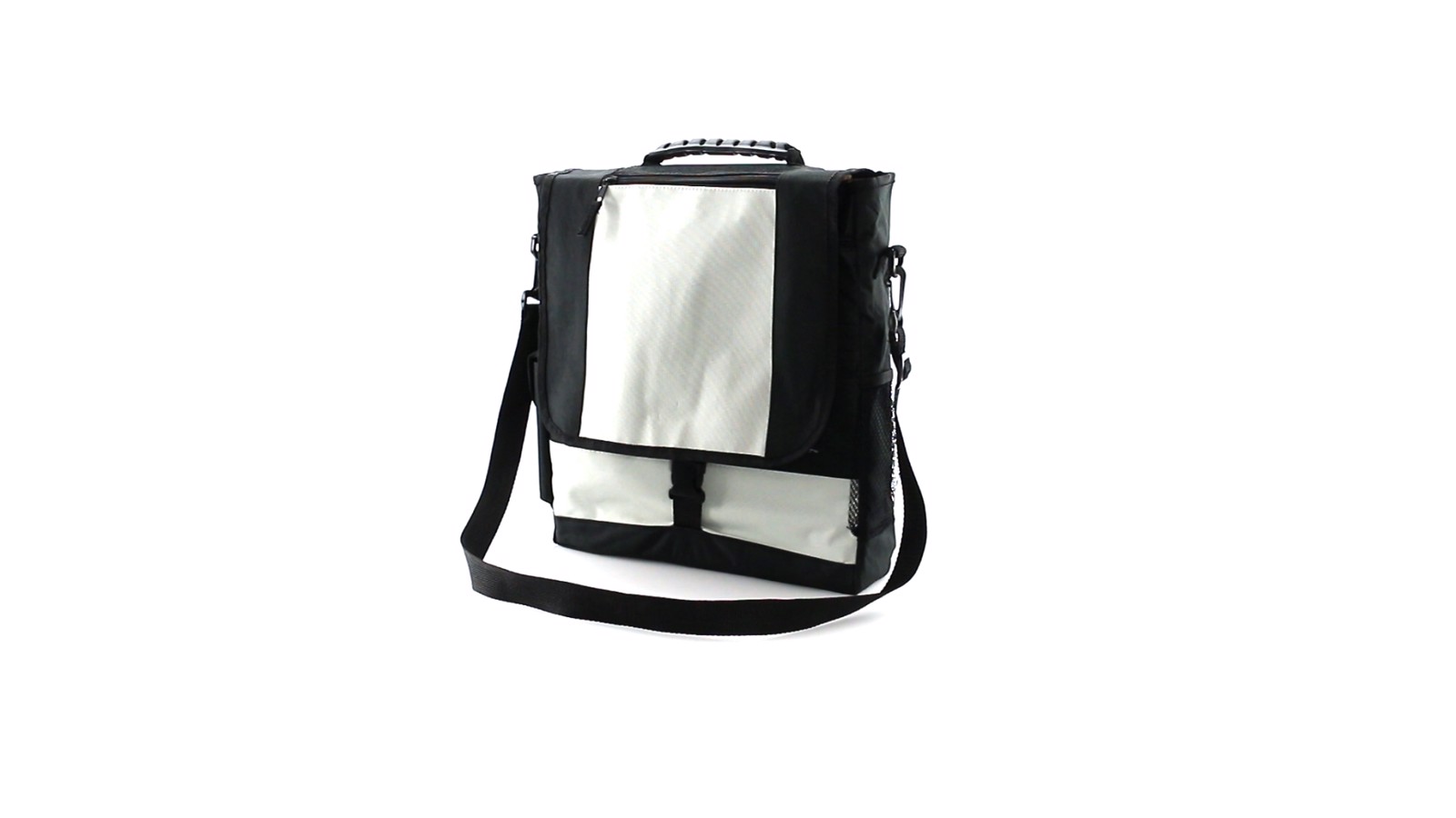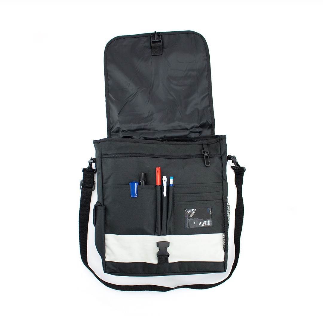 Resistant 600D polyester briefcase with velcro closure and front pocket. In an elegant bicolor finish, with reinforced handle in resistant rubber and padded inside pocket for laptops up to 14 inches. It also includes adjustable shoulder strap, elastic net side pocket, side pocket for smartphone with velcro closure and inside compartments with pen pockets. Padded Laptop Compartment