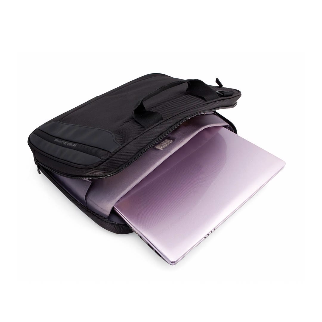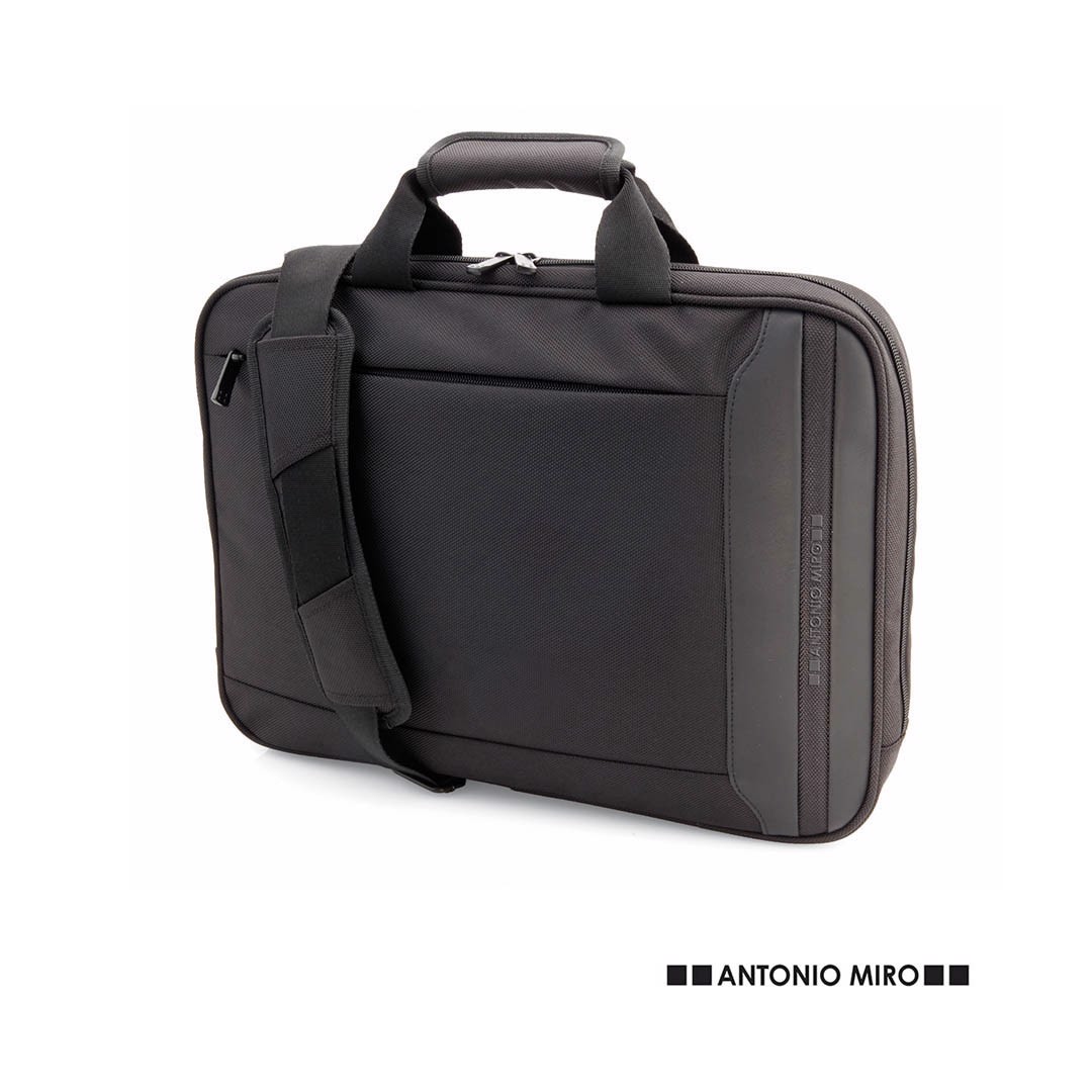 High quality briefcase by Antonio Miró with zipper closure and front pocket, in resistant 1680D polyester. Sober design, with padded compartment for laptops up to 15 inches. Comfortable reinforced carrying handles and metal front ring. With the brand logo on front. Padded Laptop Compartment