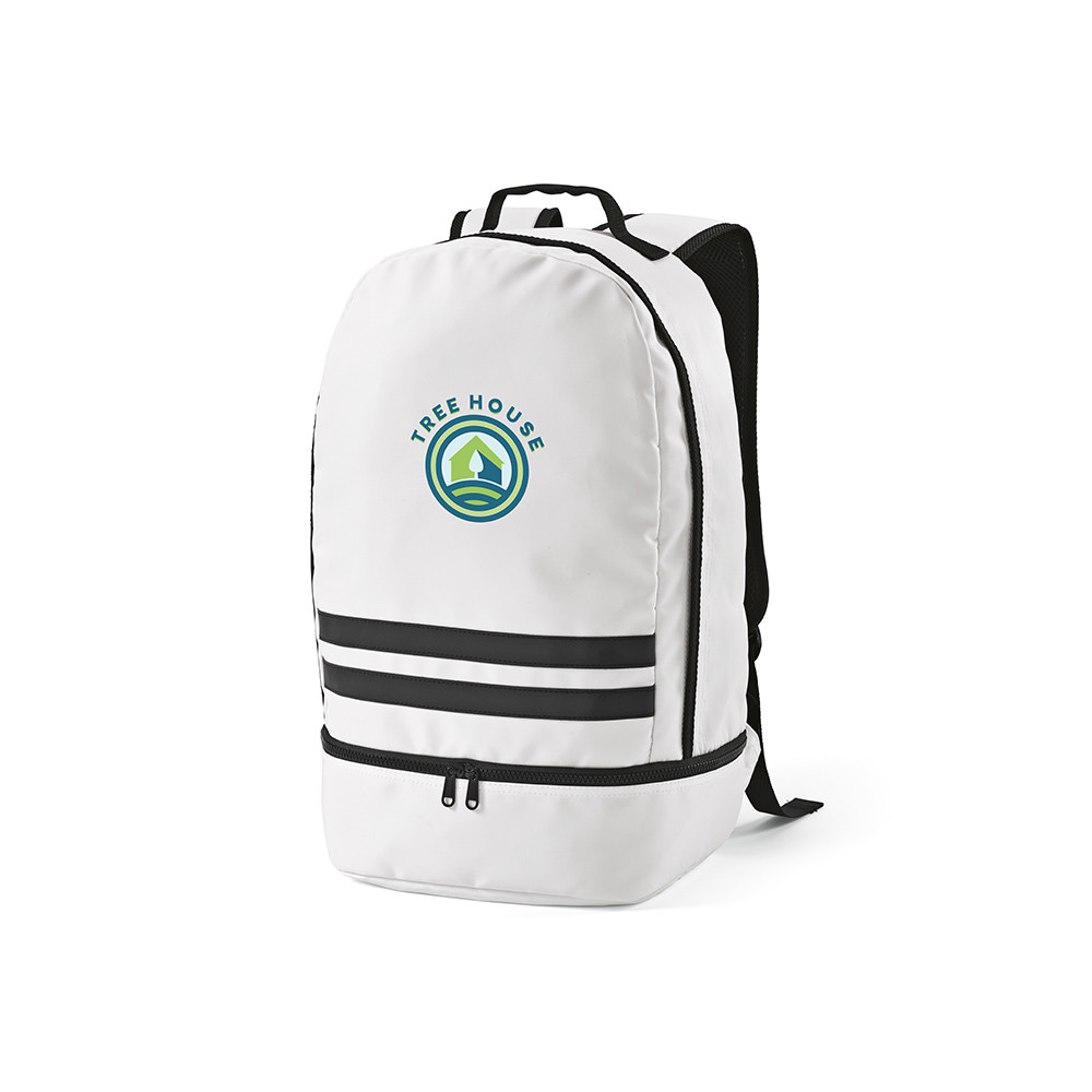 Buenos Aires Backpack made from rPET, is a 25L backpack designed with functionality in mind. This is a lightweight bag but it is not light on features. This bag features back padding, a reinforced top handle and two black reflective front stripes for safety. On the bottom, there is a separate pocket ideal for shoes. Available in 8 colours.
