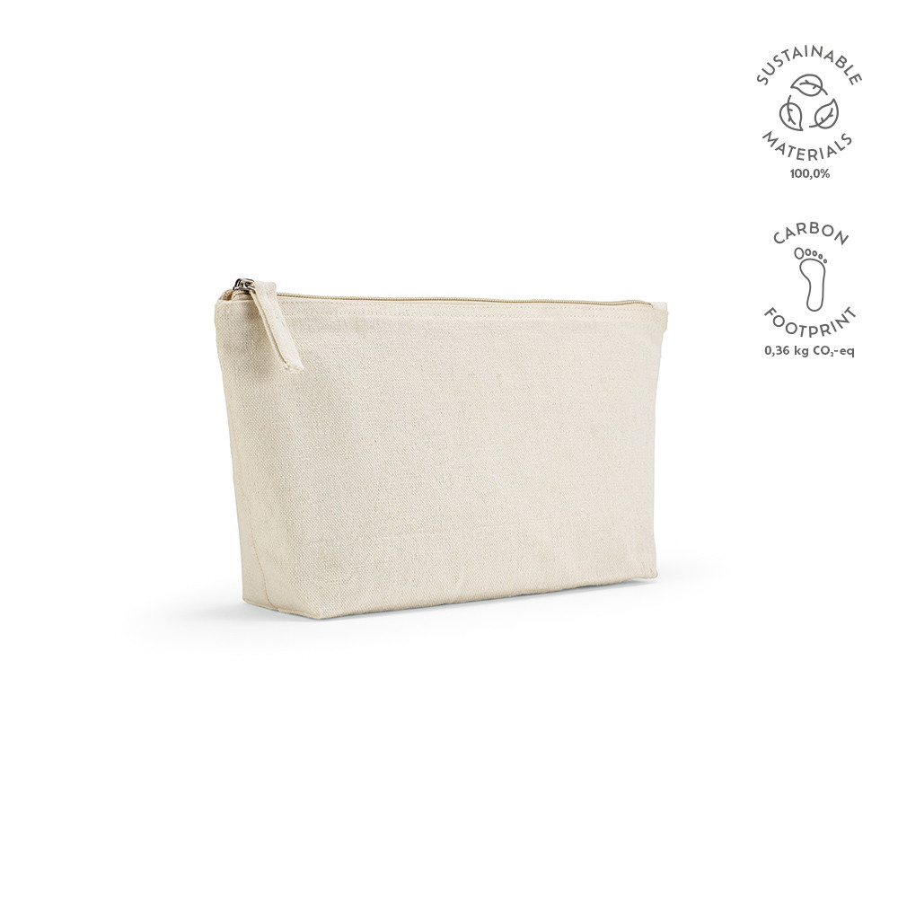 Cairo L 320 gsm recycled cotton toiletry bag (3.9L). Featuring a spacious main compartment for efficient storage and a secure zipper closure, it seamlessly combines eco-friendliness with practicality, ensuring your journey is both organized and environmentally conscious