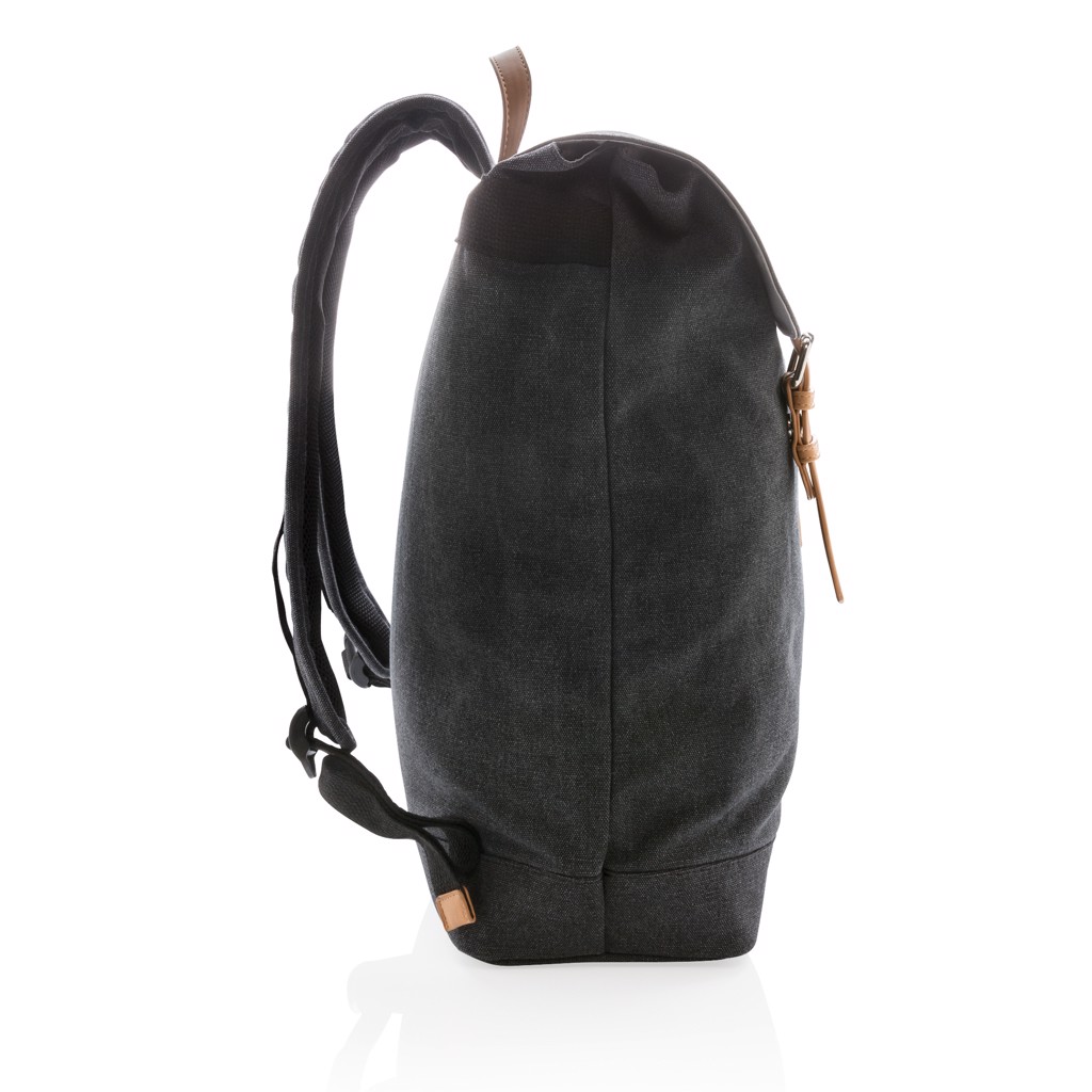 Carry your essentials for casual travel in this durable canvas backpack. This model features a padded section for your laptop up to 15.6". The top flap closes with two imitation leather magnetic buckles. PVC free.