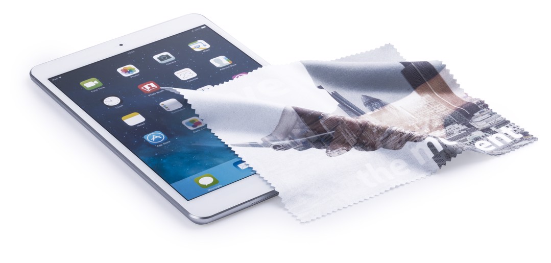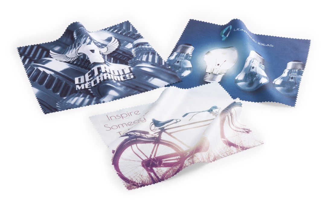 Soft microfiber cleaning cloth designed for sublimation printing. Side walls reinforced by means of safety cut in zigzag.