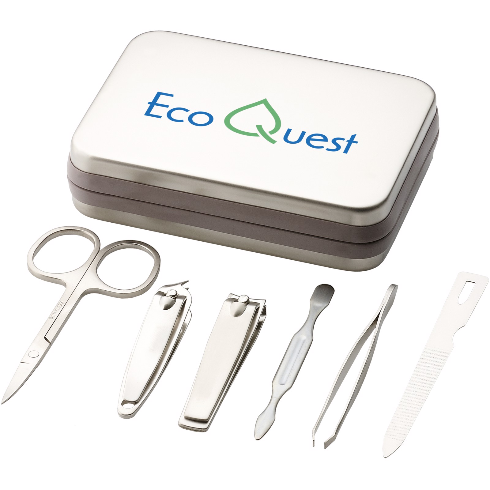 Manicure set includes scissors, a cuticle stick, tweezers, a nail file and both regular and small nail clippers and come in a tin box with EVA inlayer.