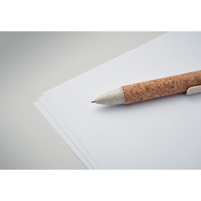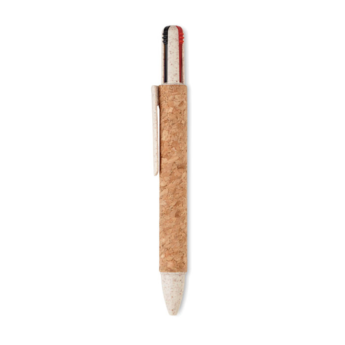 Push button 4-colour ink ball pen with cork barrel and wheat straw (50%) and ABS plastic (50%) fittings.