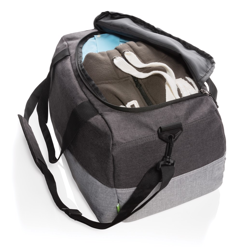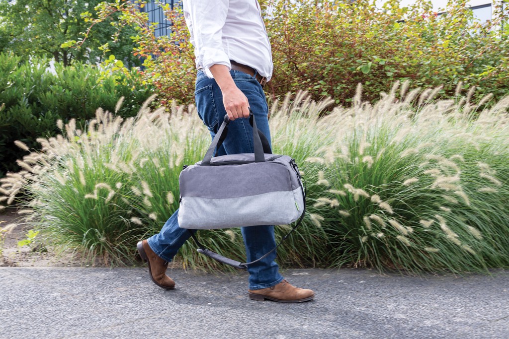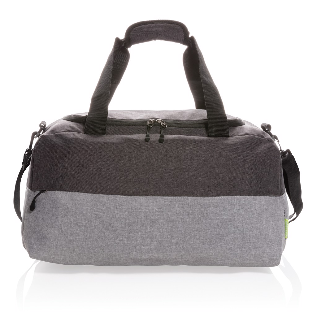 Perfect as a carry-on bag or pack for an overnight trip. This weekend bag is made of reused plastic bottles, so not only stylish in a two-tone grey but also sustainable. The bag features a U-shaped top opening for all your gear, one large front pocket for quick access to your belongings and a RFID pocket for your passport and wallet. A top handle and a removable shoulder strap provide versatile carrying options. PVC free. Exterior: 100% 600D melange RPET / Lining: regular 210D polyester.