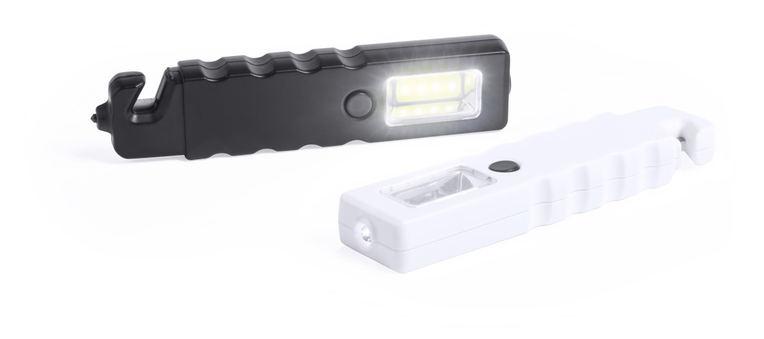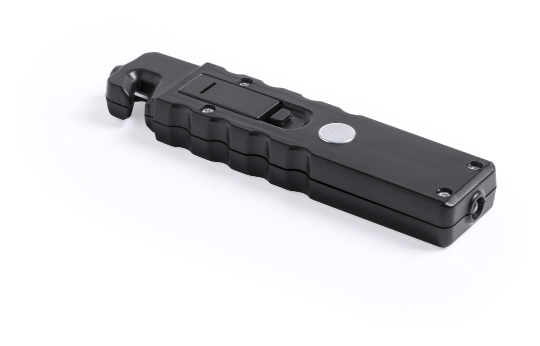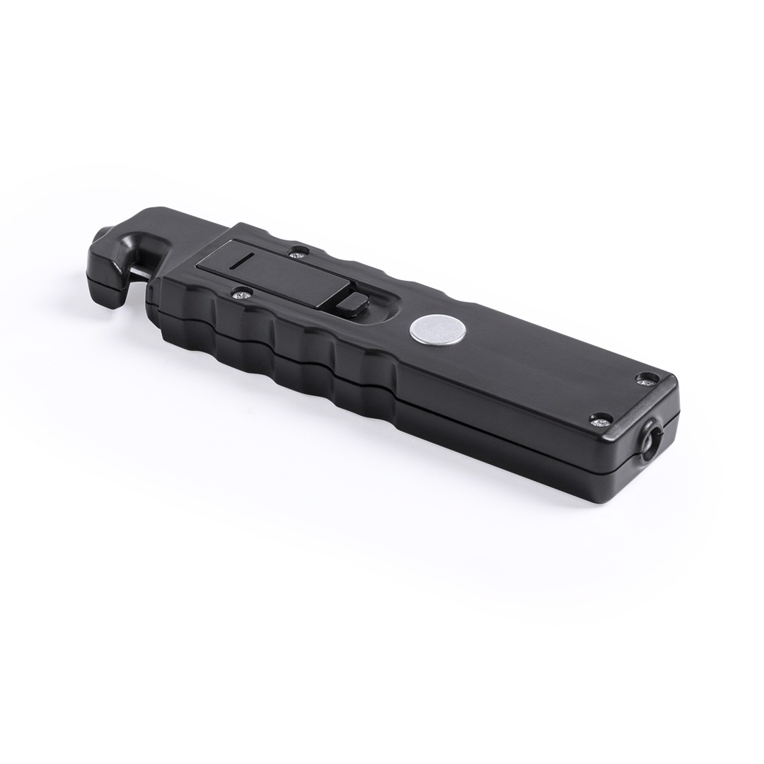 3-in-1 emergency hammer with LED flashlight and 4 COB lights with 3 illumination modes. With magnetic surface and belt cutter blade. 1 Led. 4 COB Lights. 3 Light Modes. 3 Functions. Magnetic. Button Batteries Included