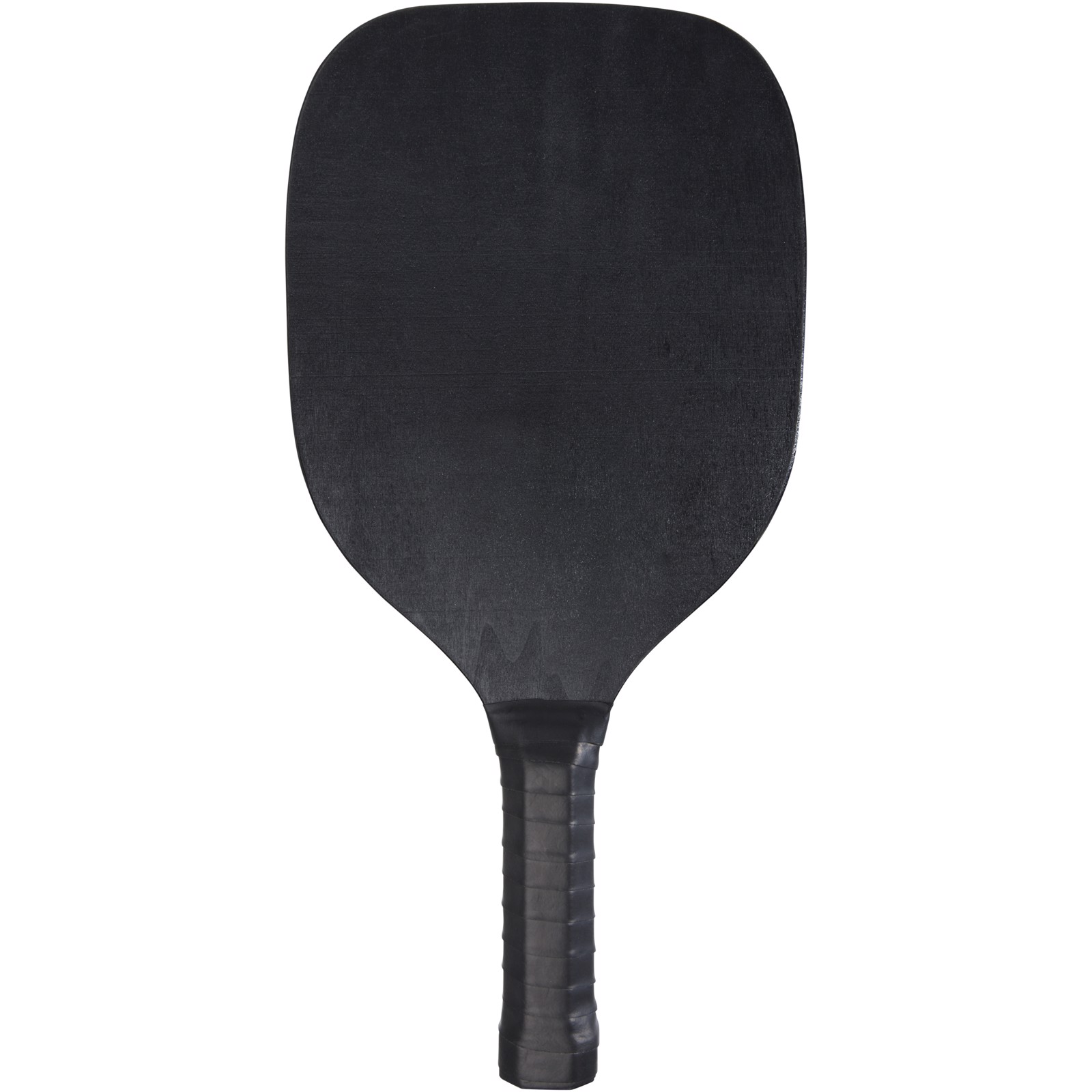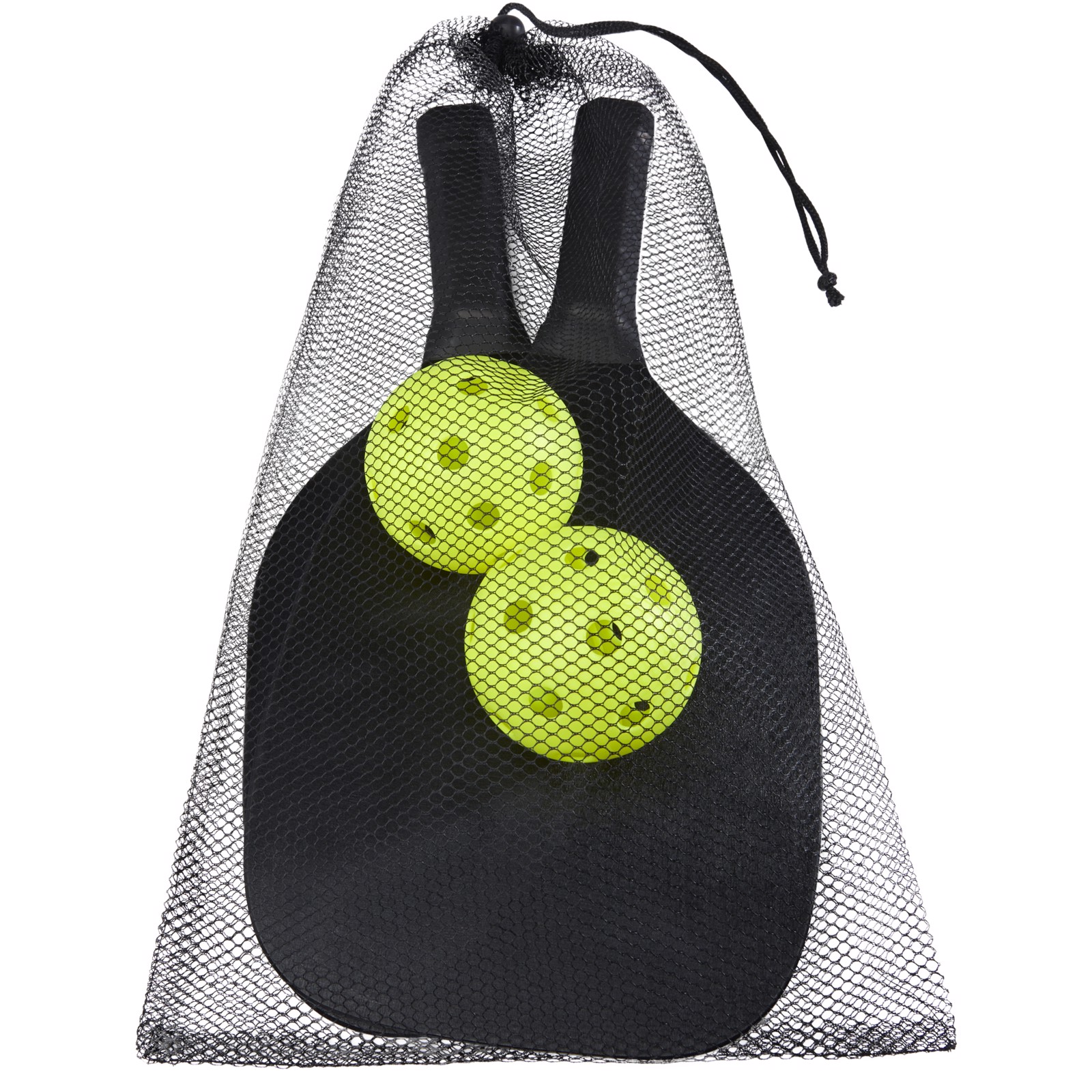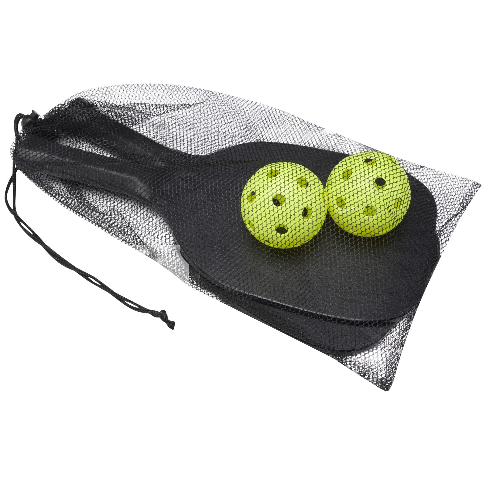 This paddle set made of poplar wood provides a lot of fun and exercise for two on the beach, in the park or the garden. The paddles have a size of 40 x 20 x 0.7 cm and are painted in black colour, providing large surface for printing any logo. The handles are wrapped with PU tape giving maximum grip during an intense game. The set is completed with 2 balls made from PP material and is packed in a mesh polyester storage pouch with a size of 45 x 26 cm. Warning! Not suitable for children under three years. Small parts. Choking hazard.