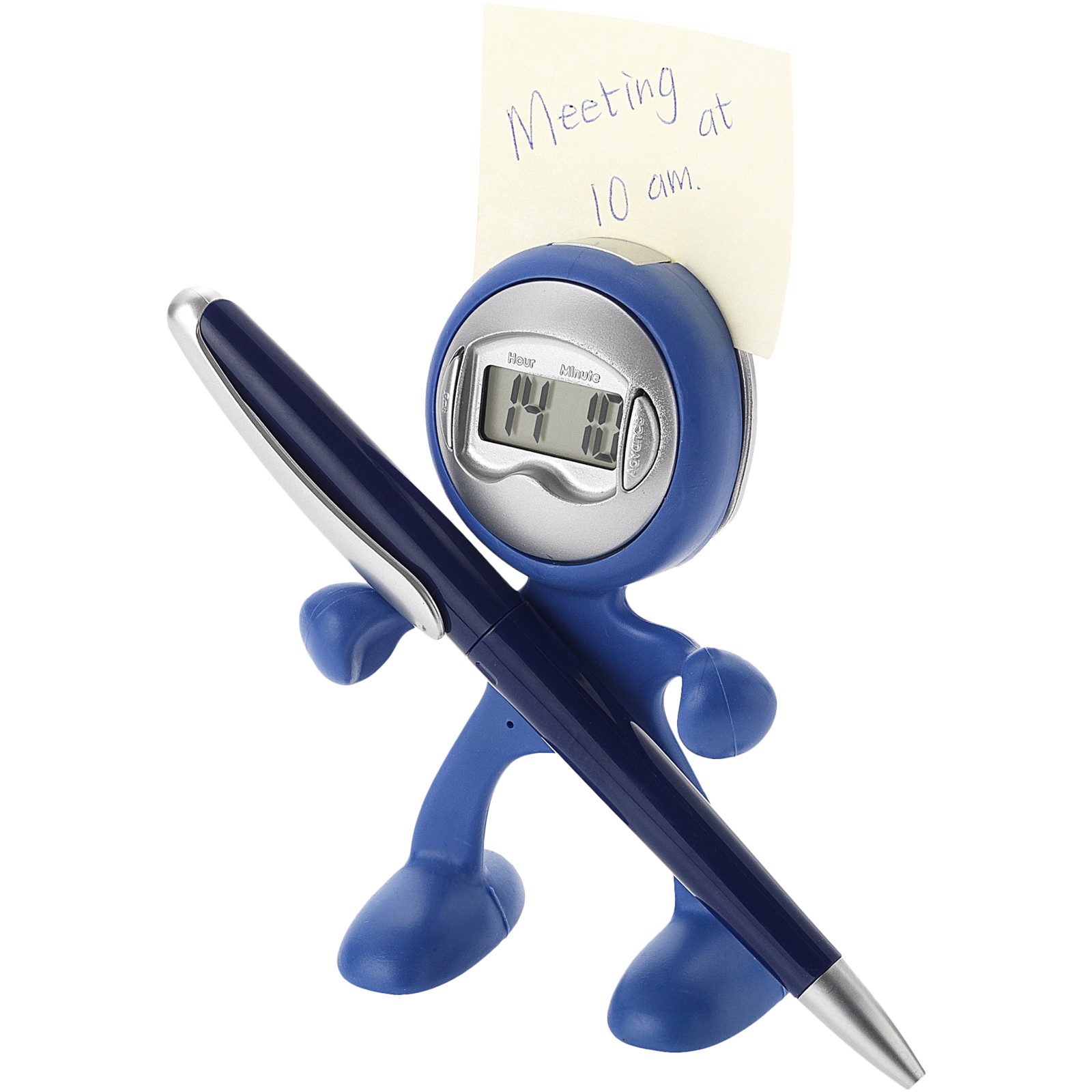 Alarm clock, memo holder, pen holder and phone holder gadget in flexible material which makes it possible to change the shape of the item. Batttery included.
