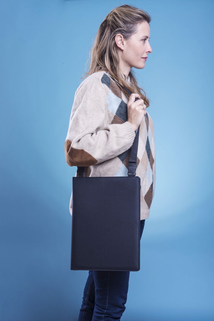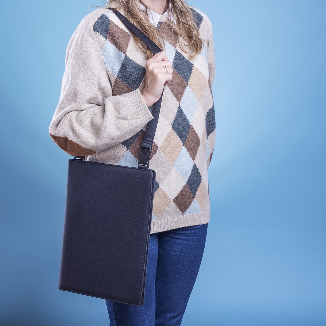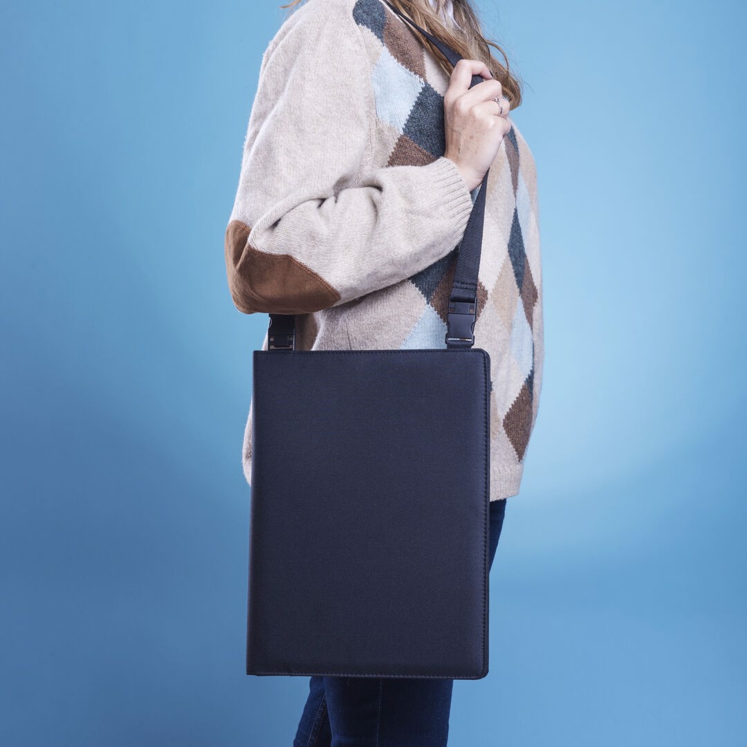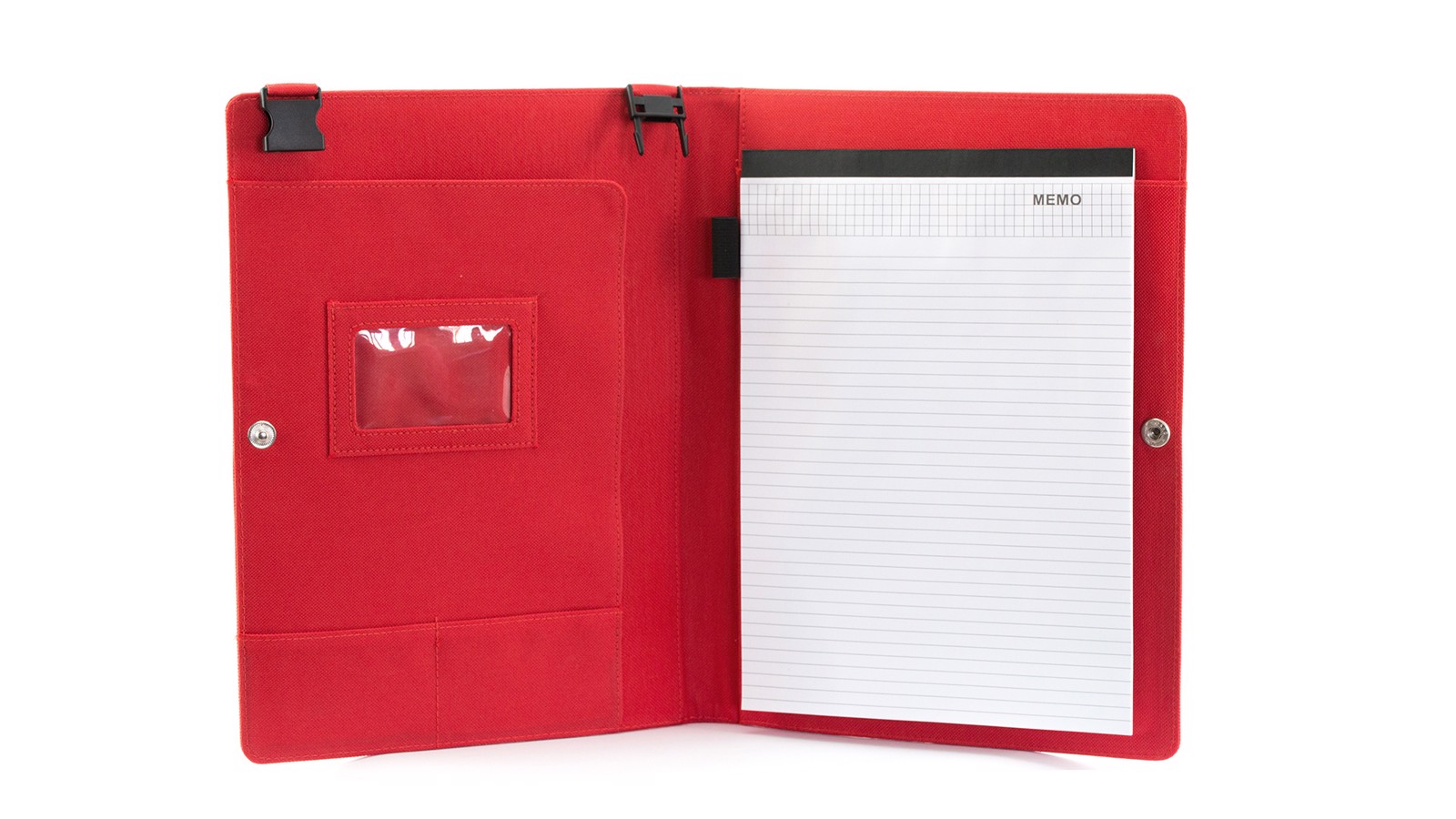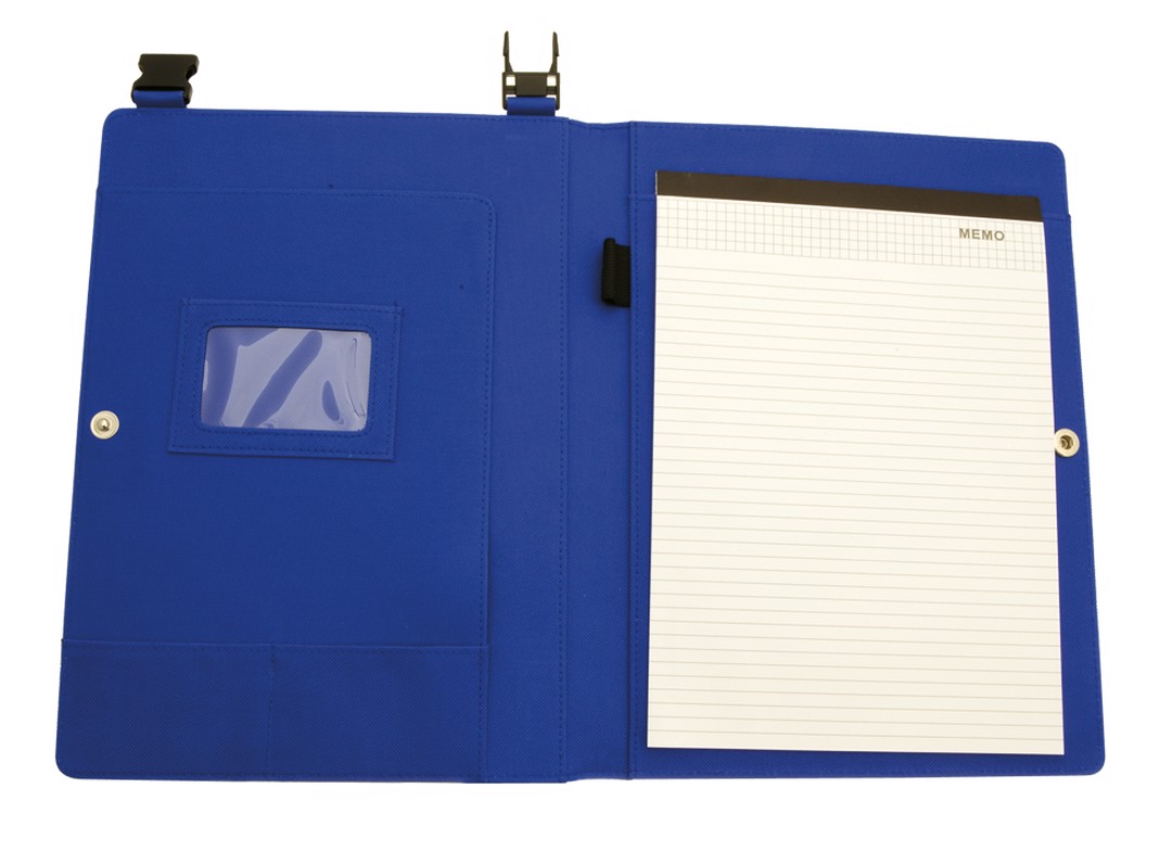 Original 600D polyester folder with removable shoulder strap. Inside with removable notepad of 20 blank sheets, flap pocket, card holders and pen holder. 20 Sheets Notepad