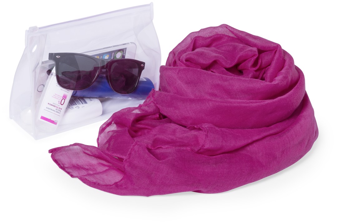 Soft pareo/foulard in combination of viscose material and polyester in vivid colors. Presented in transparent PVC case with zipper. Beauty Bag Included