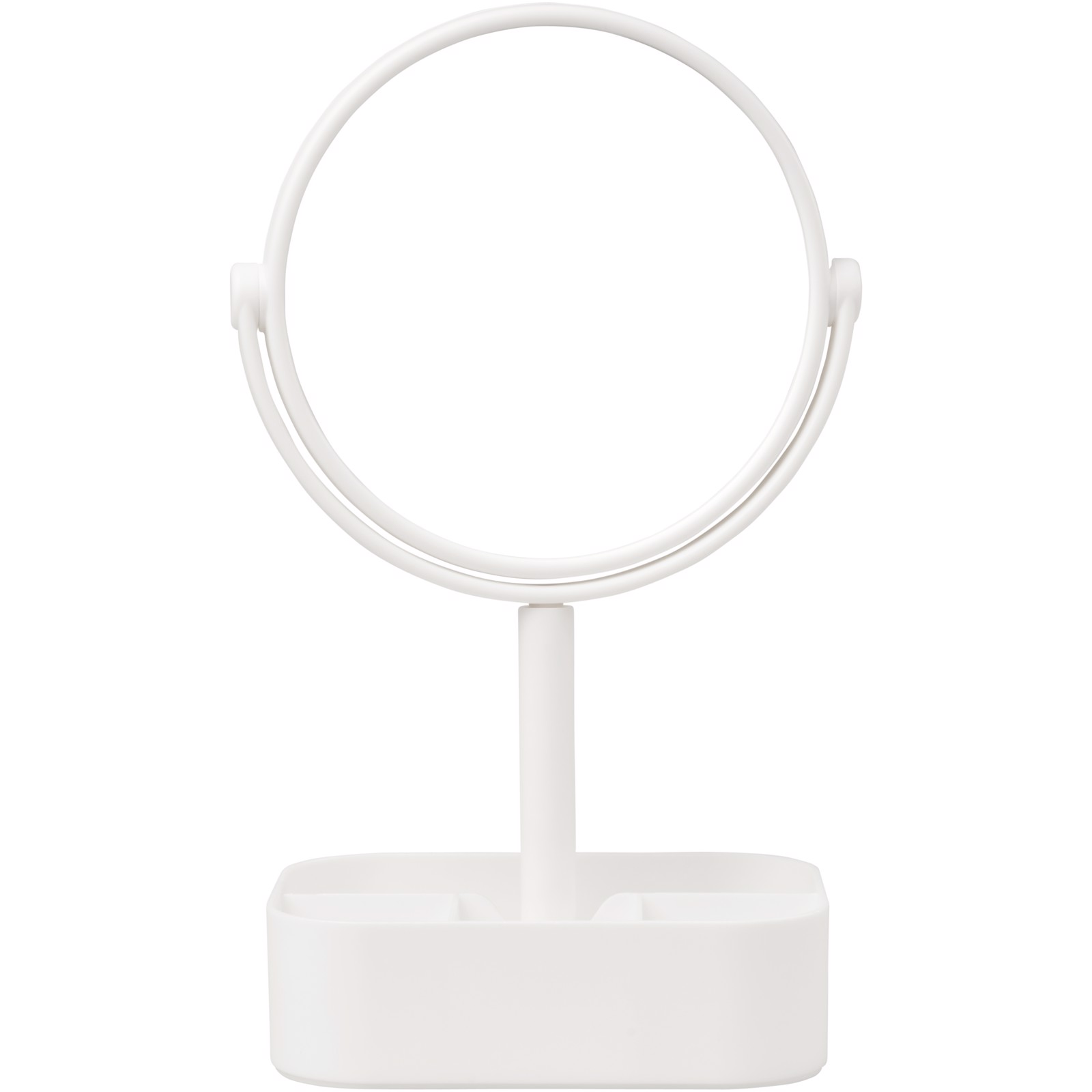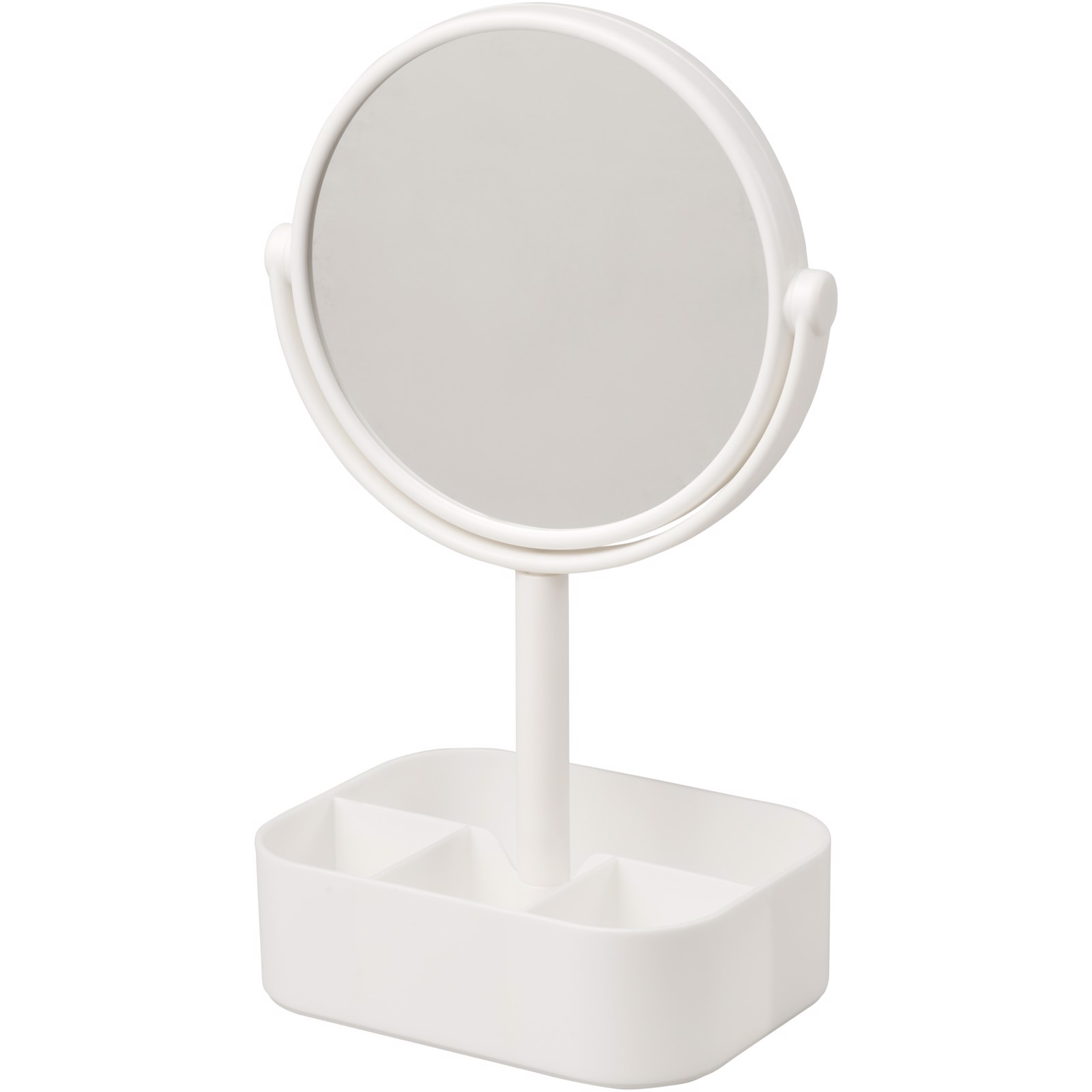 Double sided revolvable mirror with organiser base. Once rotated the mirror gives a 2x magnified view.