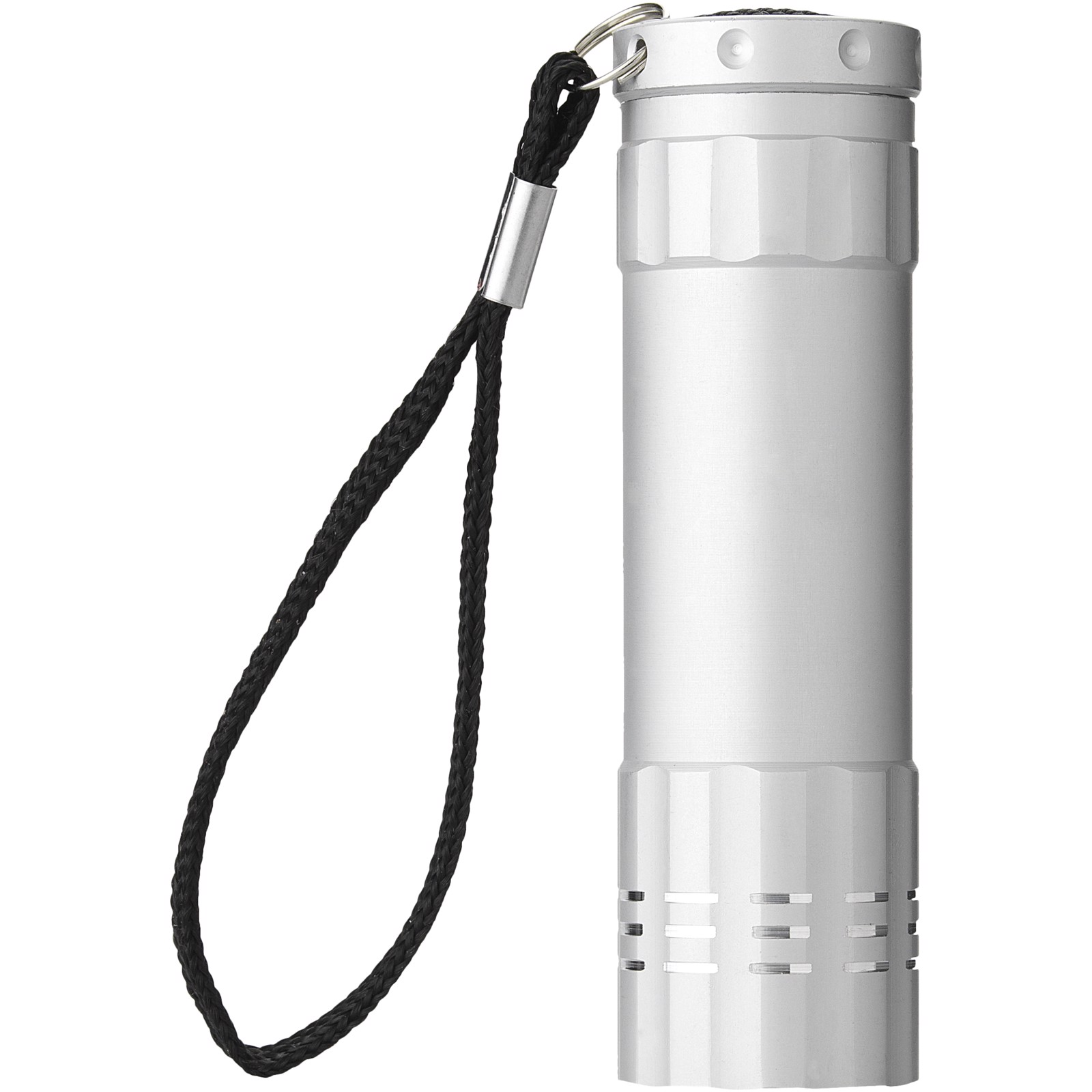 Stylish bright white 9 LED torch with wrist strap and push button on/off power switch at the back. Requires 3x AAA batteries (not included).