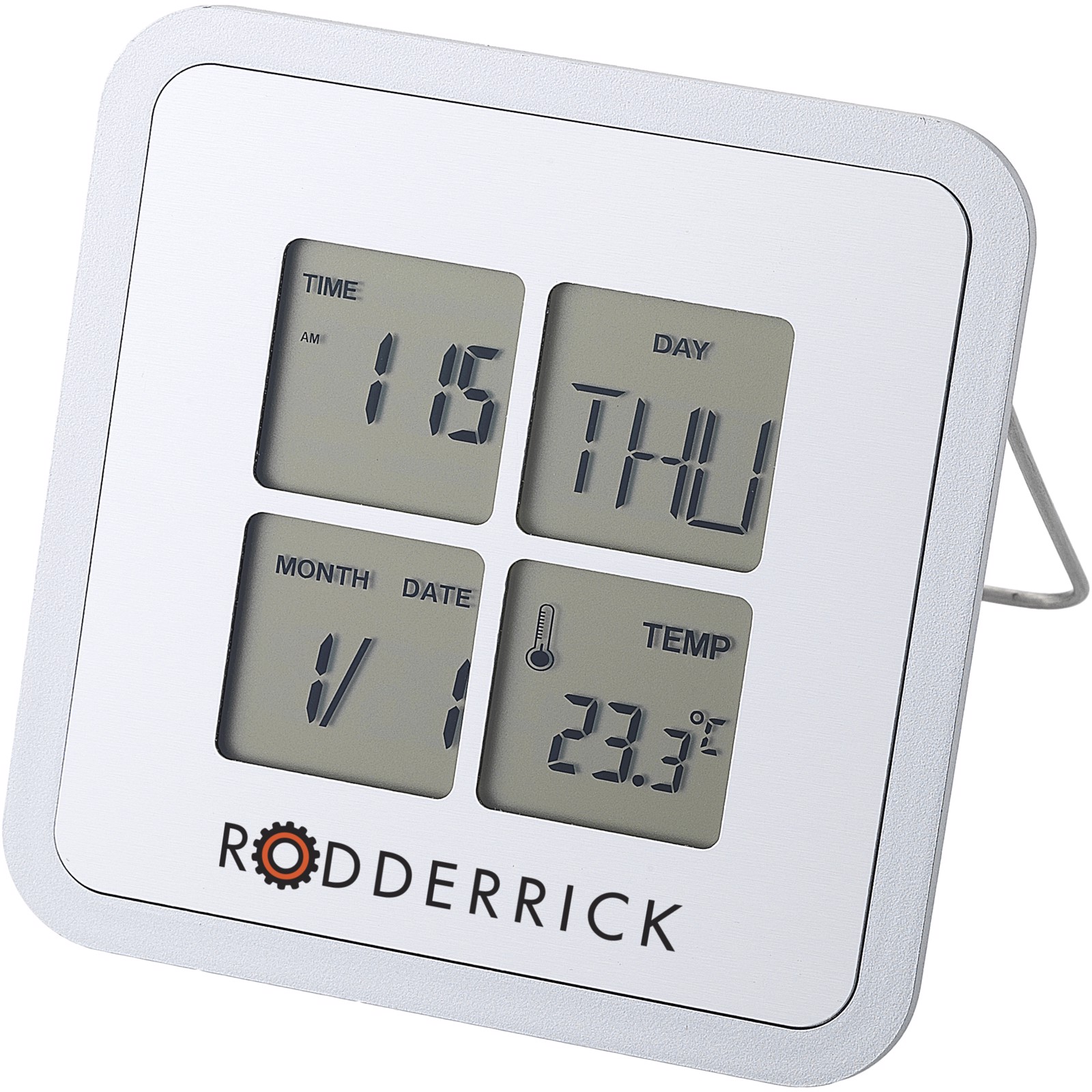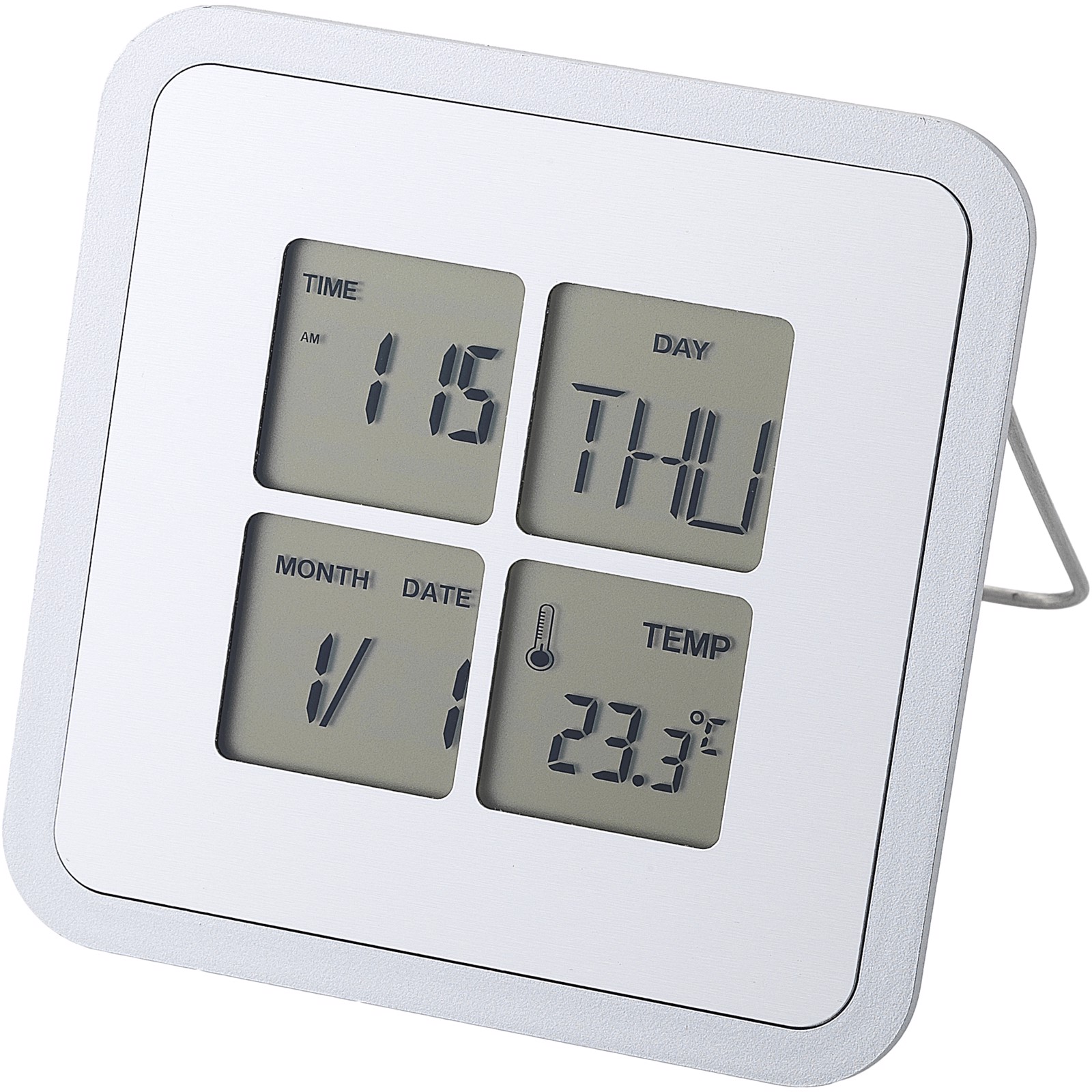 Desk clock with time function, alarm function, snooze function, calendar and C/F thermometer. Battery included.
