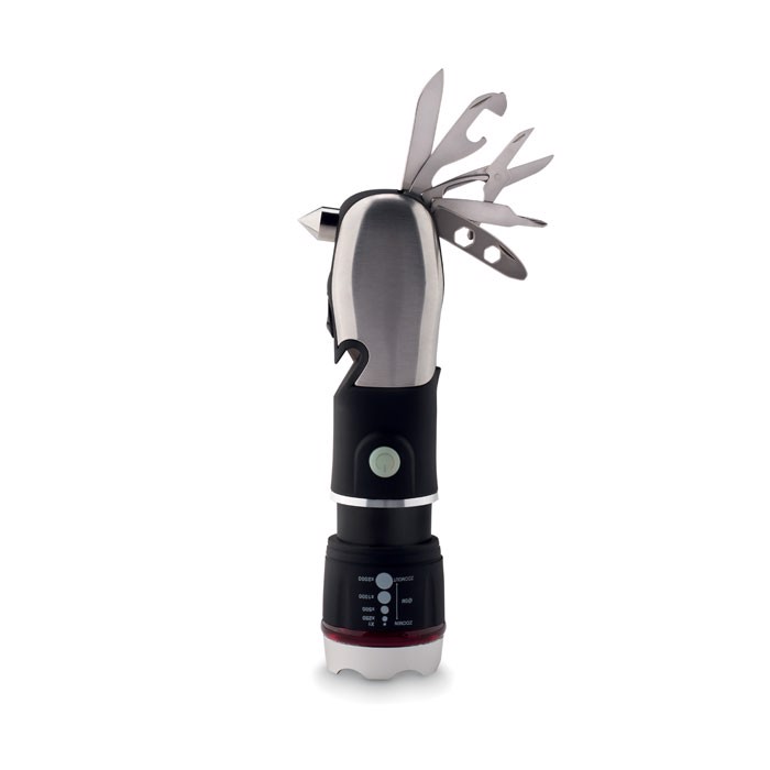 Multi-tool with torch, safety hammer and cutter. Includes 9 tool functions. ABS with rubberised finish. 3 light settings with zoom function. 3 AAA batteries not included.