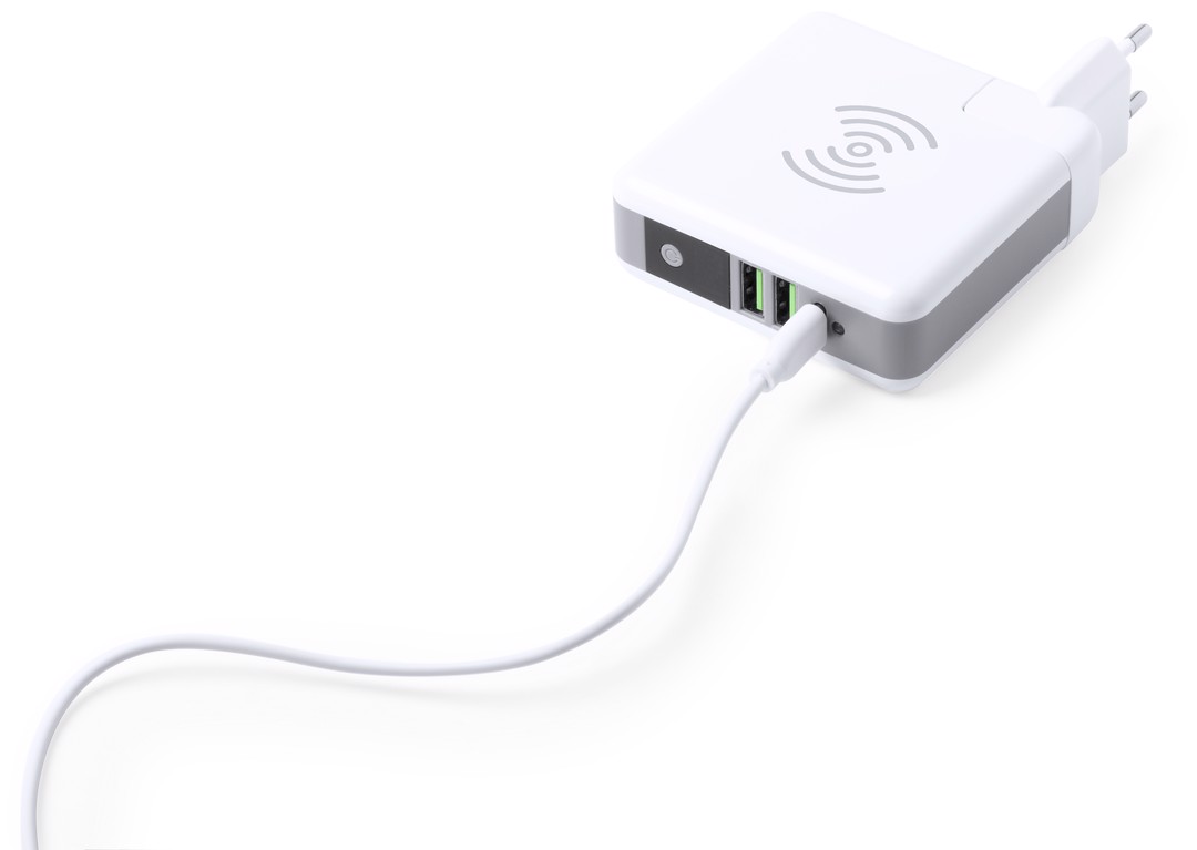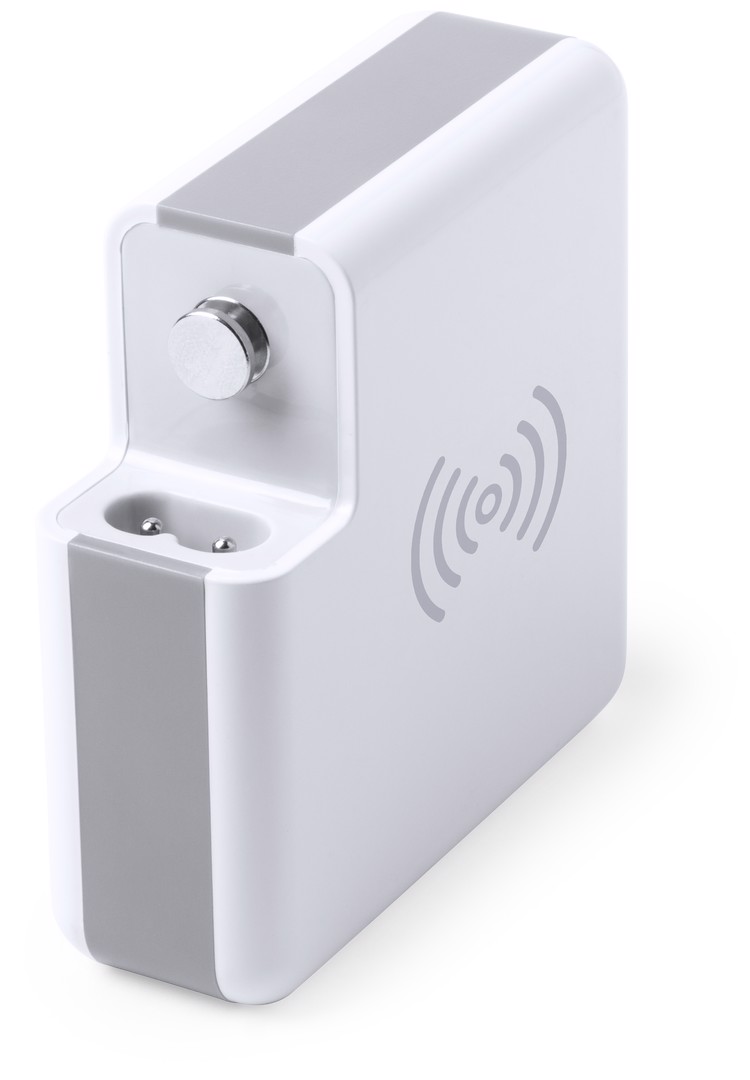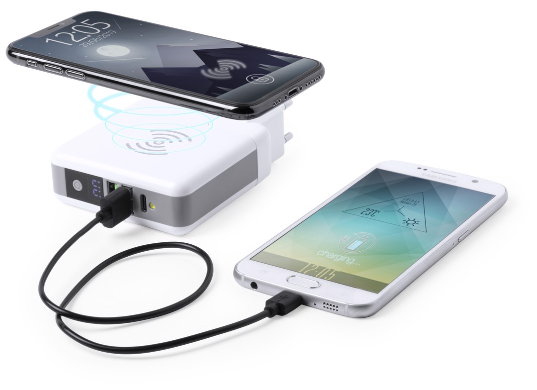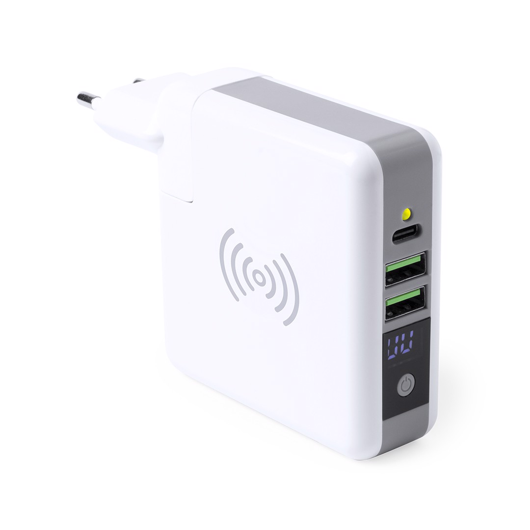 Wireless, multi-function and multi-output travel adapter with 6,700 mAh charging capacity integrated power bank. In an elegant white color design, with a wide printing area. Wireless charging function, including dual, Type-C, 3,000 mA input-output connection and 2 USB outputs of 2,400 mA. LCD screen with charging status indicator and wall pugs for the USA, Europe, Asia, UK and Australia. Simultaneous working flow for all functions. Presented in an attractive, individual, design box. Wireless. 6700 mAh. 2 USB Outputs 2400 mA and 1 Type C Output 2400 mA. Type C Input. USA, Europe, Asia, UK, Australia