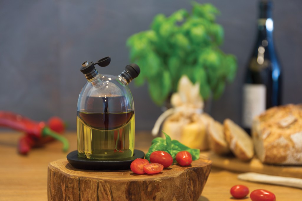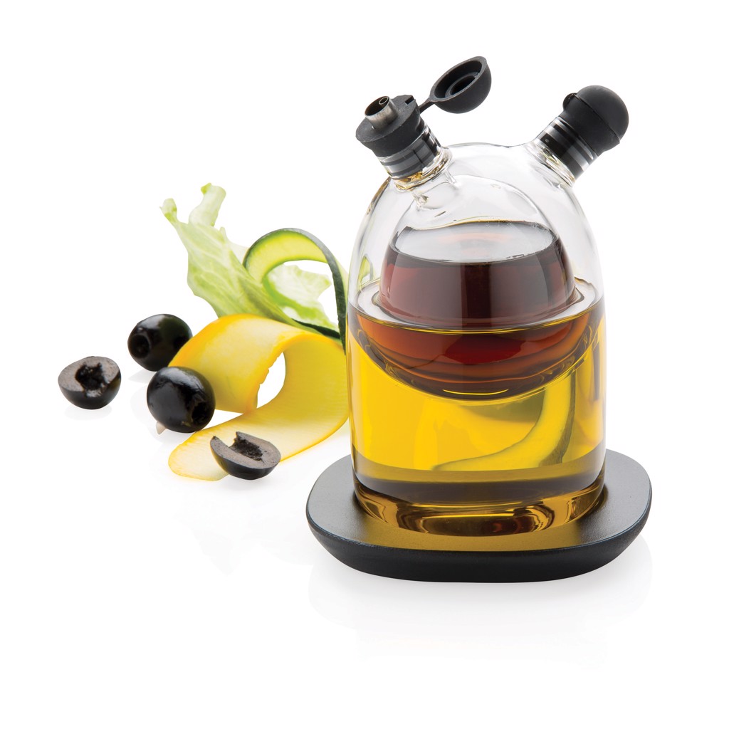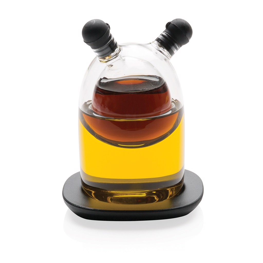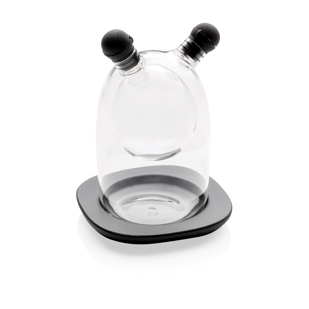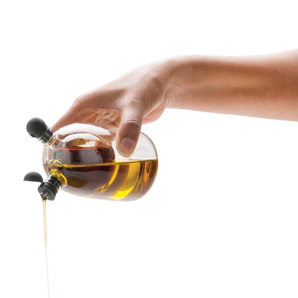 Unique oval mouth-blown glass bowl for oil and vinegar. Two chambers: inner capacity of 60 ml and outer capacity of 140ml. Perfect for storing and serving oil & vinegar from the same bottle. Handwash recommended. Registered design®