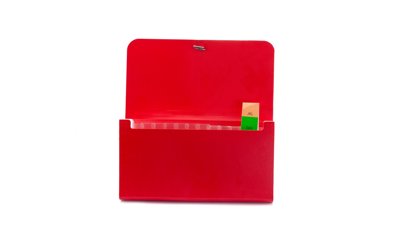 Organizer folder of ingenious elastic closure, in resistant material and in varied colors. Inside with 12 translucent finish dividers with upper identification tab. 12 Dividers