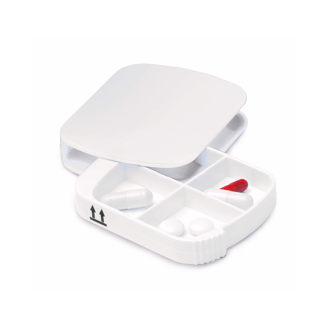 Practical pill box with removable inside in 4 compartments in a wide range of tones. With external indicator to avoid accidental falling of the pads. 4 Compartments