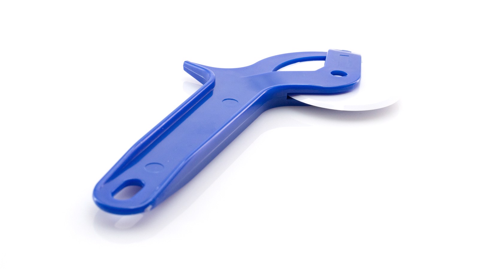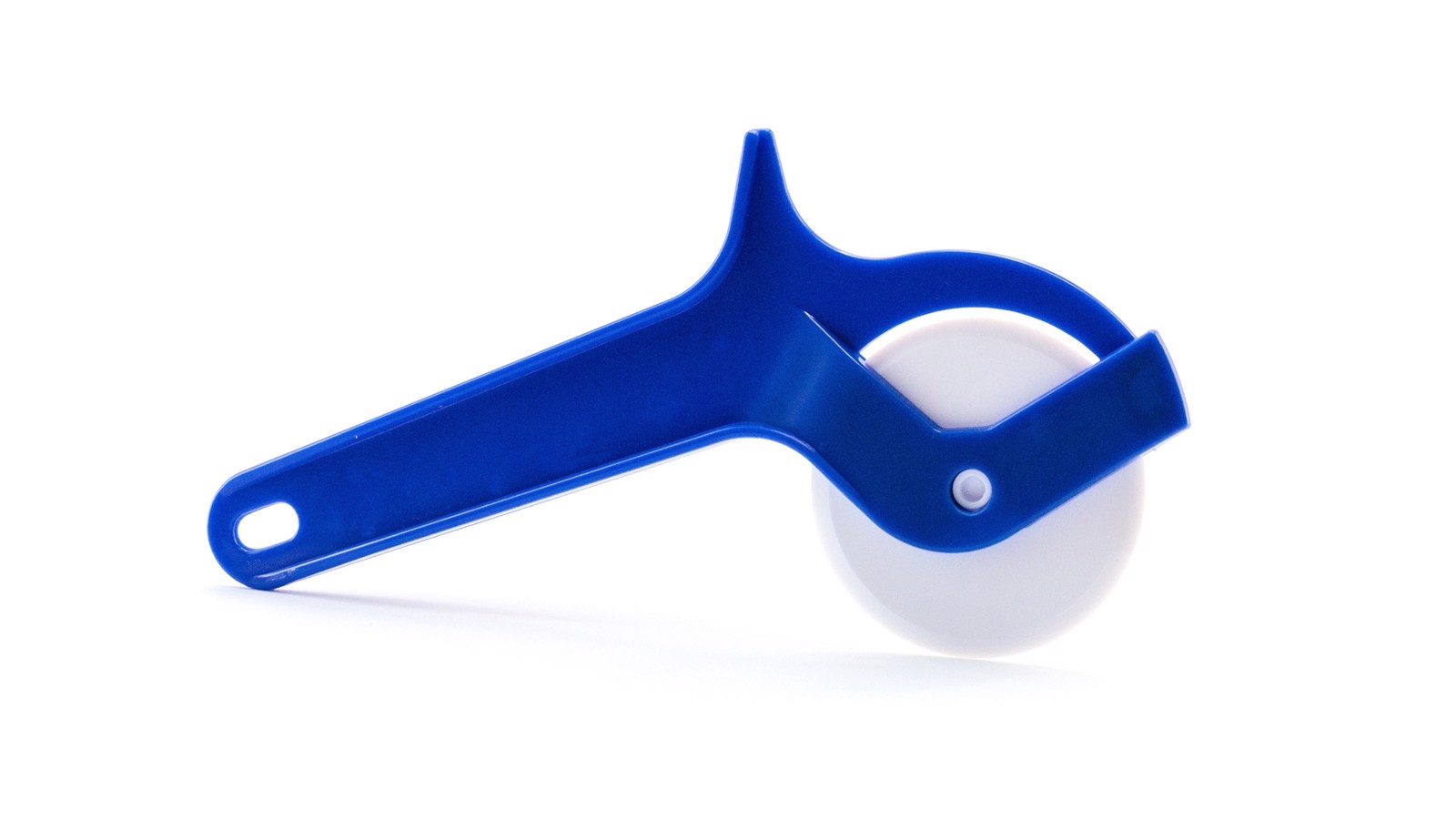 Pizza cutter in a wide range of bright tones with white cutting blade and die-cut handle for hanging.