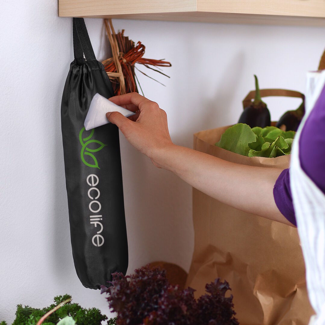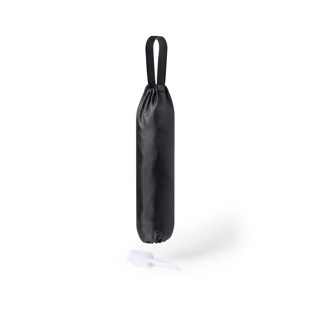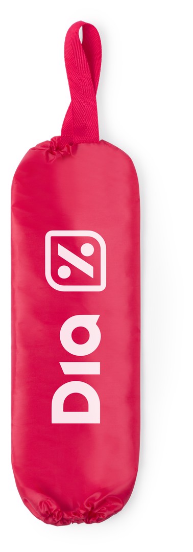 Recycling bag to store plastic bags. In soft polyester 210D of bright tones and with upper and lower opening. With matching color hanging strap.