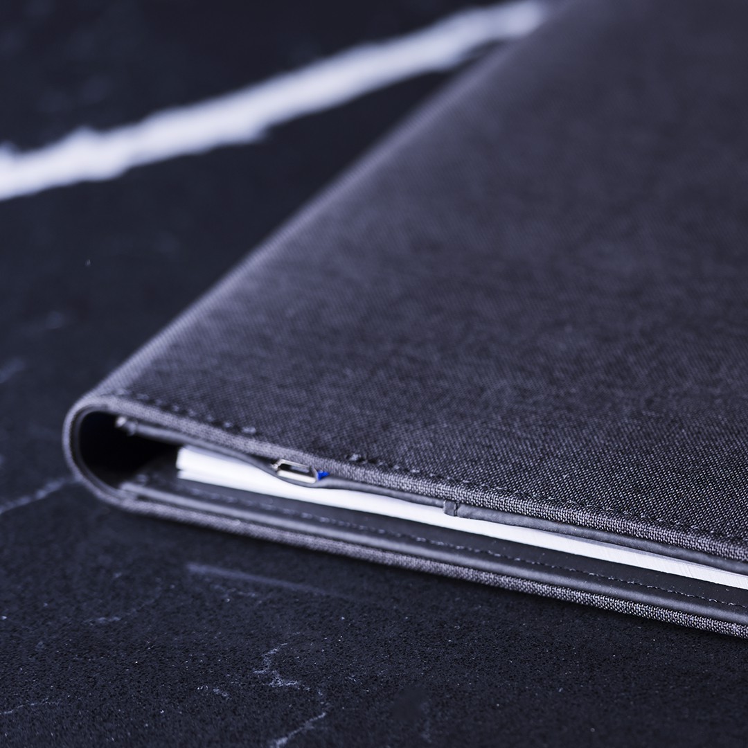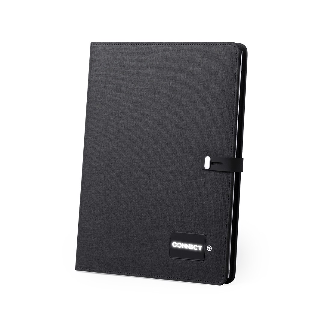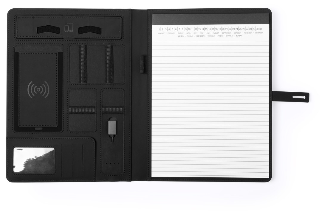 Resistant, 300D polyester folder with built-in 4,000 mAh external auxiliary battery. In sober design and with original closure, including a printing surface on the cover especially designed for laser printing, illuminating the logo. Plenty of storage compartments for business cards, USB sticks, plus a wireless charger/case for smartphones. LED charge indicators and USB output for conventional charging. Including a 20 sheet notepad and a support for mobile devices. The easy access to the charging station via micro USB cable - included- make of this folder the perfect gadget for business and studying. Presented in an elegant black box. The capacities shown in all our external auxiliary batteries are real, all of them incorporating non-recycled, grade A batteries, with a service life of at least 500 charging cycles, and complying with CE regulations. In addition, they are manufactured according RoHS standards, and in compliance with the following safety requirements: Power bank overcharge