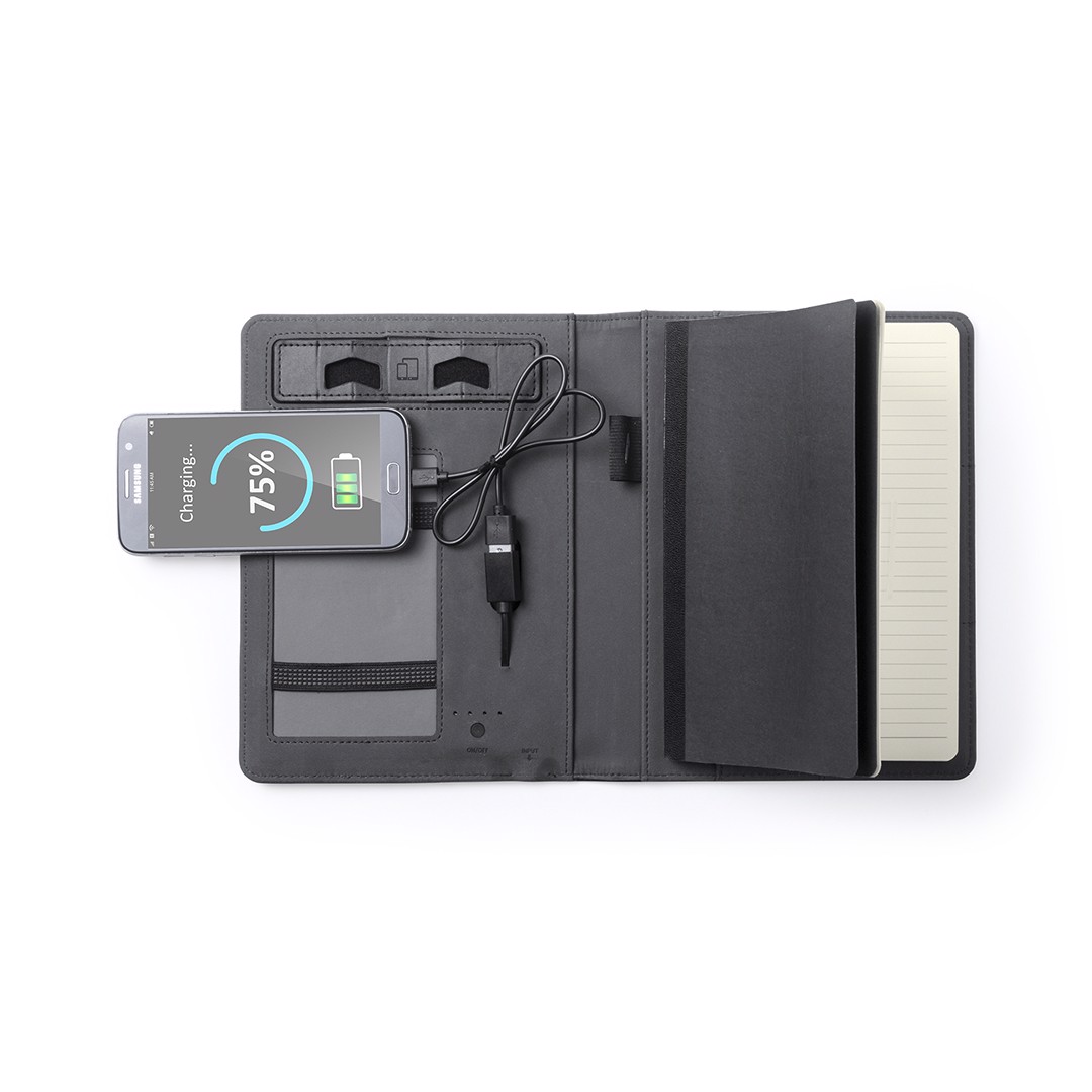 Elegant PU leather notepad with integrated, 3,000 mAh charging capacity external auxiliary battery. Including card holder, pen holder, and case for smartphone and/or other mobile devices. The easy access to the charging station via micro USB cable -included- makes this pad the perfect gadget for business and studying. The capacities shown in all our external auxiliary batteries are real, all of them incorporating non-recycled, grade A batteries, with a service life of at least 500 charging cycles, and complying with CE regulations. In addition, they are manufactured according RoHS standards, and in compliance with the following safety requirements: Power bank overcharge protection system. Complete discharge protection system, which increases the durability of the power bank. Blocking system to prevent short circuits. Constant charging transfer system, in accordance with the capacity of the target device. 3000 mAh. Micro USB Input. 65 Sheets Notepad. Cable Included