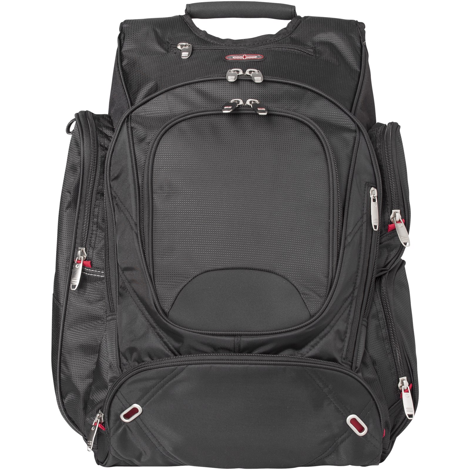 This exclusive design has a designated laptop-only section that unfolds to lay flat on an x-ray belt to increase speed, convenience and security. Side entry laptop compartment holds up to 17" laptops. Main zippered compartment with file divider, interior side pockets and removable TechTrap elastic organiser panel. Zippered media pocket accesses ear bud port. Front zippered pocket and key fob. Front lower & hidden pockets for valuables. 3 side roomy zippered pockets. Back panel designed to slip over trolley handles.