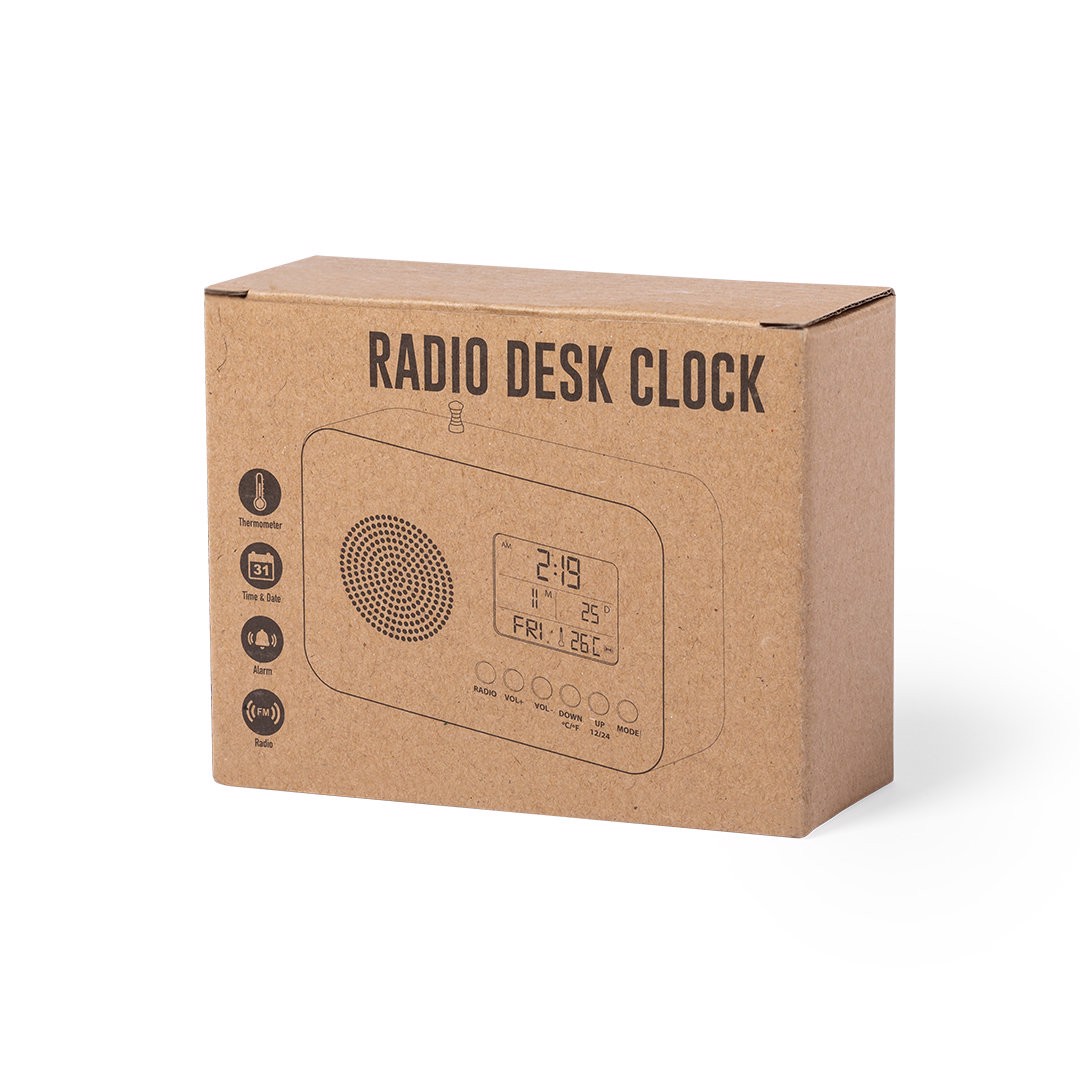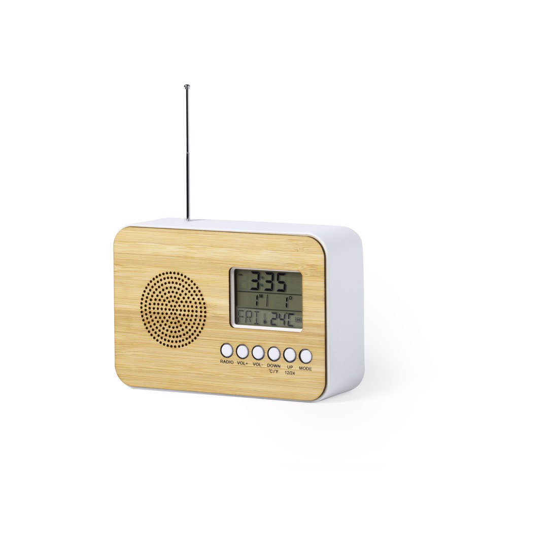 Radio clock in nature line with front panel in bamboo. Functions: alarm, calendar, thermometer and FM radio, with retractable antenna. Battery powered (2xAAA not included) and presented in an attractive, individual, eco-design box. 2 Batteries AAA Not Included