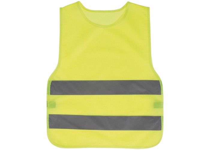 Yellow safety vest for kids with two reflecting stripes and elastic bands on the sides. Made of firm but light polyester which makes the vest comfortable to wear. Complies with the European EN1150 standard.