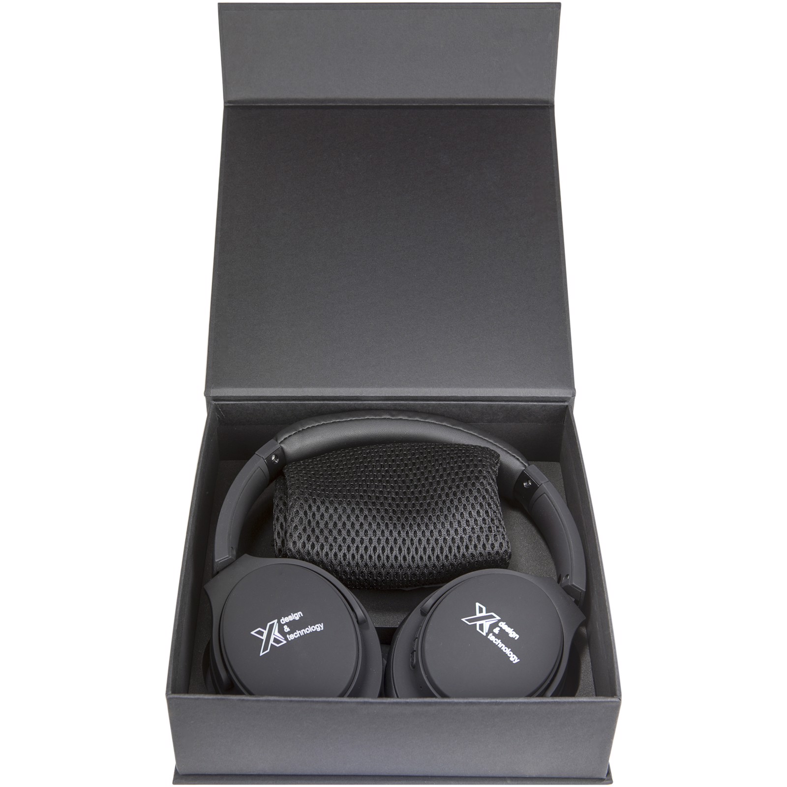 Light-up logo headphones with antibacterial treatment and soft-touch function. Bluetooth® 5.0 EDR technology (Enhanced Data Rate), with built-in radio and emergency battery. Has an embedded microphone that allows for phone conversations. Comes with an audio connector to connect devices without Bluetooth®. Input/output: 5V/1A. Operating frequency: 20 Hz - 20 kHz. Charging time: 2 hours. Delivered with a gift box with magnetic closure, made out of recycled paper.