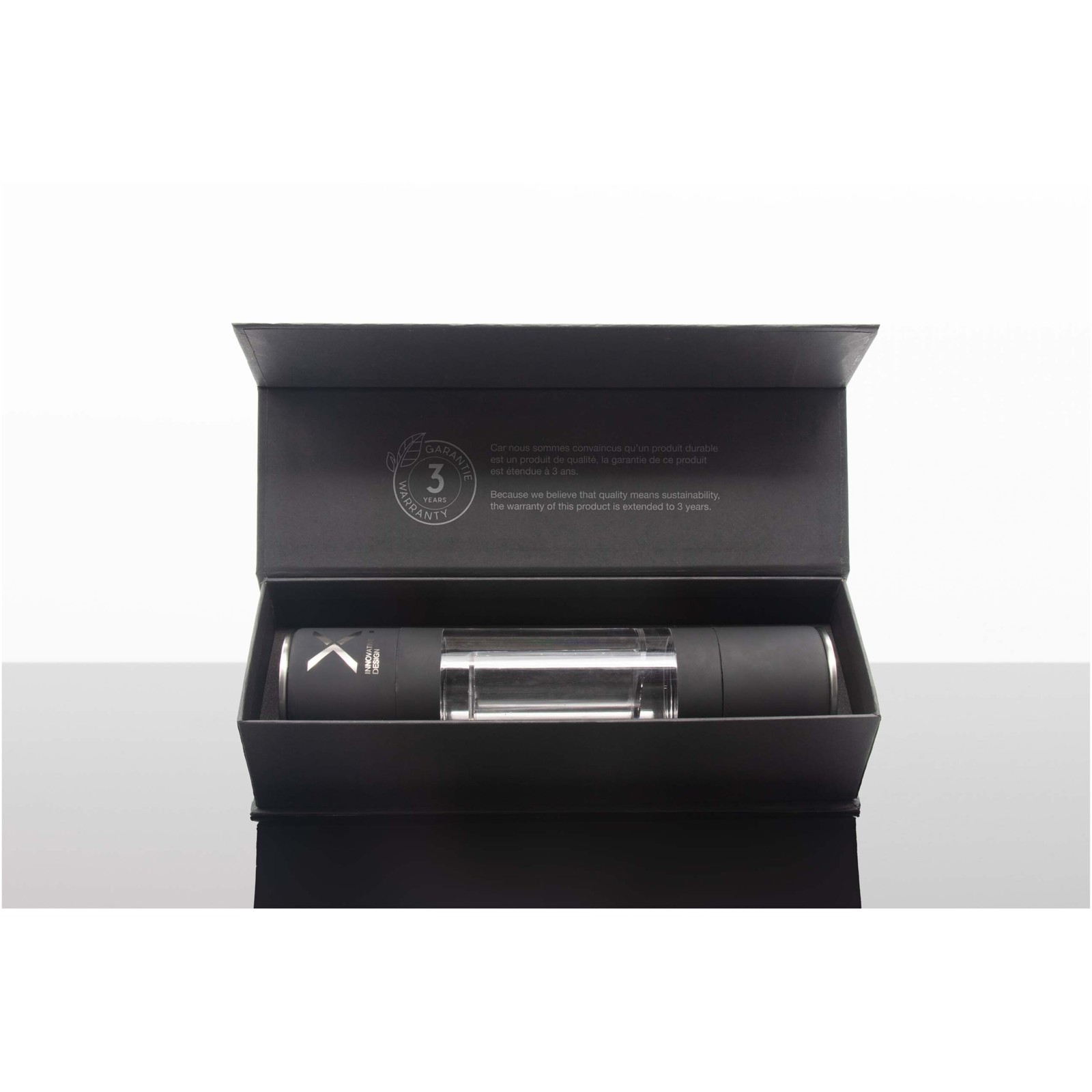 Elevate your seasoning experience with this double ceramic mill, combining innovative functionality with elegant design. To fill, simply unscrew the top to access each compartment, add coarse dry salt or whole peppercorns, then secure the lid. A discreet button at the base allows you to adjust the grind to your preferred coarseness. Can be customised with laser engraving with a metallic effect. Delivered in a recycled cardboard gift box. Salt and pepper not included.