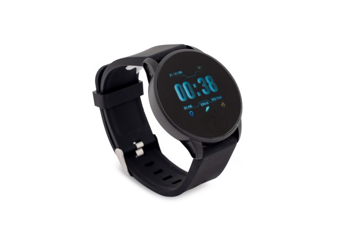 Round smartwatch has silicone straps and a plastic case. The sturdy appearance makes it an extremely suitable watch to wear during a workout. The smartwatch contains functions as measuring blood pressure, oxygen level and heart rate, but it can also be used as a stopwatch. Keep track of the distance you walked and the calories you burned. It even notifies you when you receive a message and/or calls. Connect the smartwatch easily to a smartphone. With IP67 water resistant. Will be delivered in a gift box.