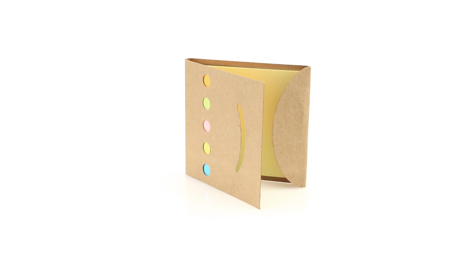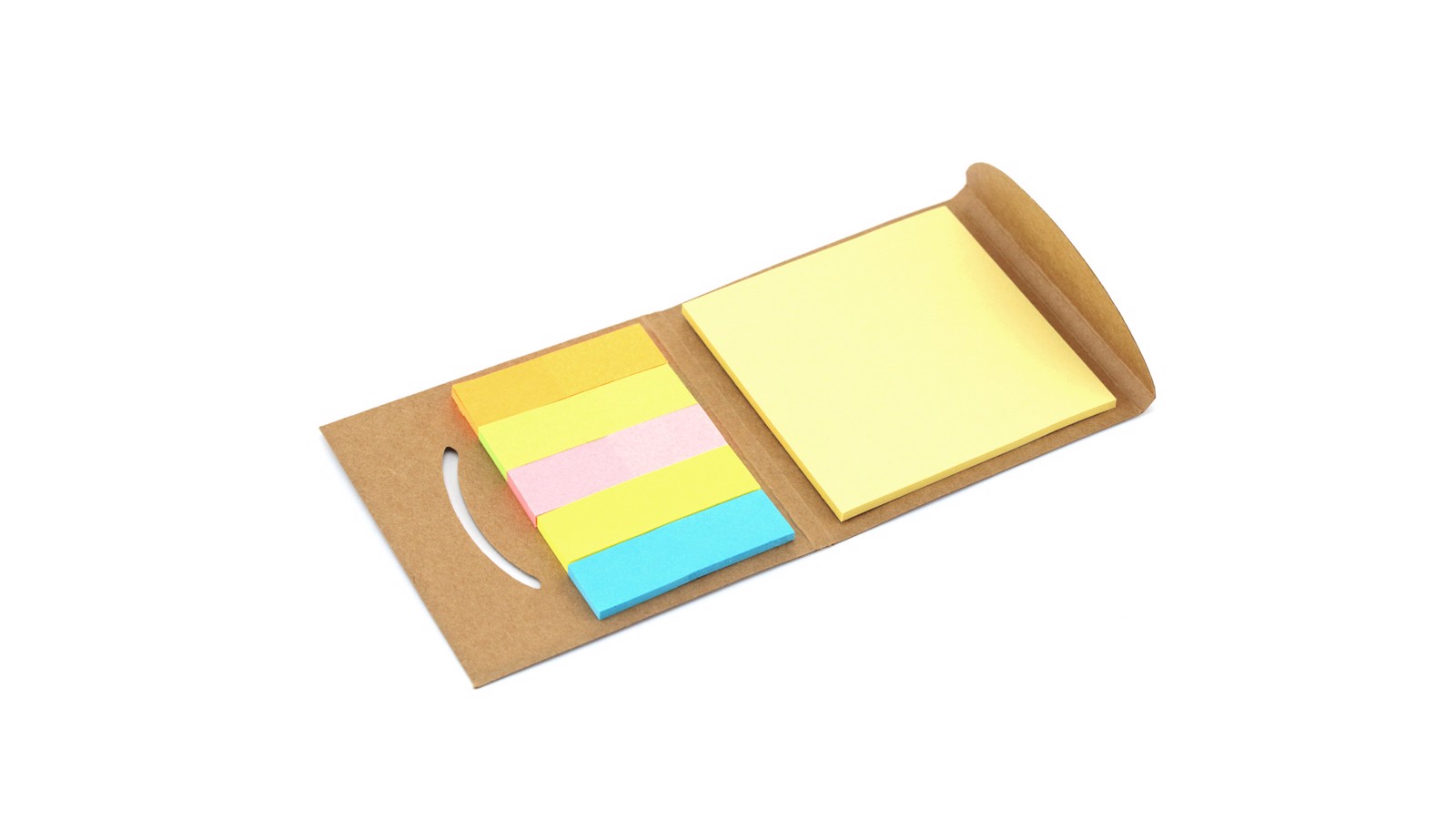 Sticky notepad with die-cut, soft-touch cover in recycled, with self closure. With 25 large sticky notes and 125 mini sticky notes. 25 Sticky Notes 7,6 x 7,6 cm. 125 Mini Sticky Notes 1,5 x 5 cm