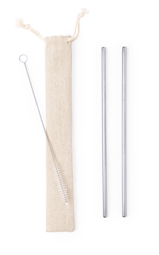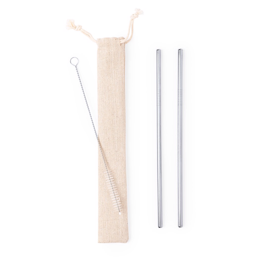 Reusable straw in stainless steel material. Including cleaning accessory and presented in a 100% natural cotton bag with closing ribbons. 2 Pieces. Reusable. Cleaner Included