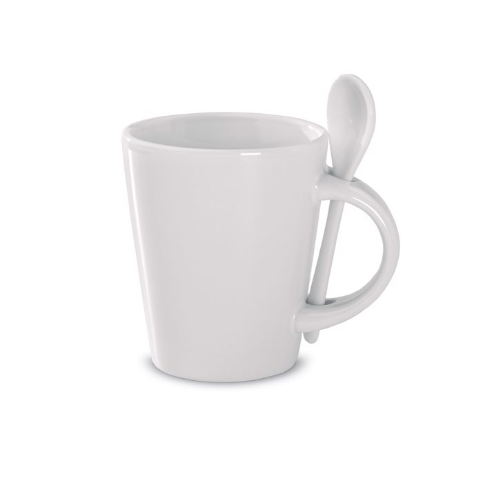 Stoneware mug of 300 ml capacity with special coating for sublimation printing. It has a spoon on handle. Individual packing in white carton box.
