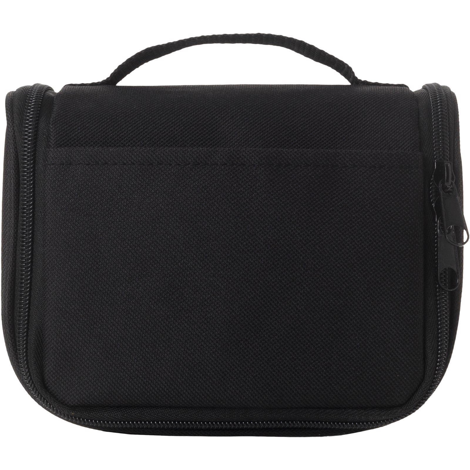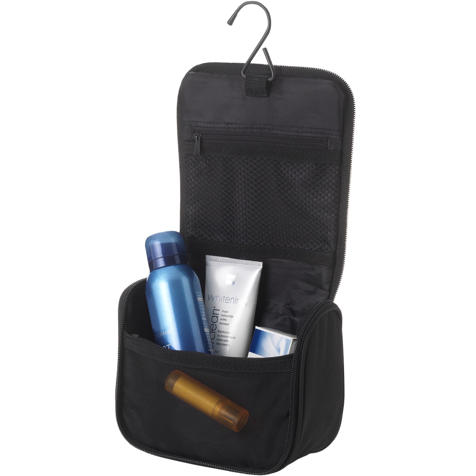Smart, small and compact hanging toiletry kit with rear metal hook. Main compartment with gusseted elastic pockets for toiletries and handy see-through mesh sections.