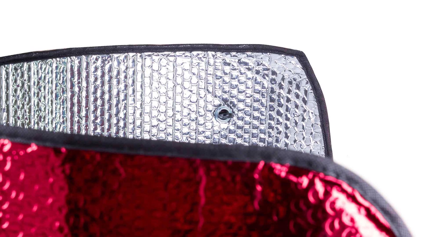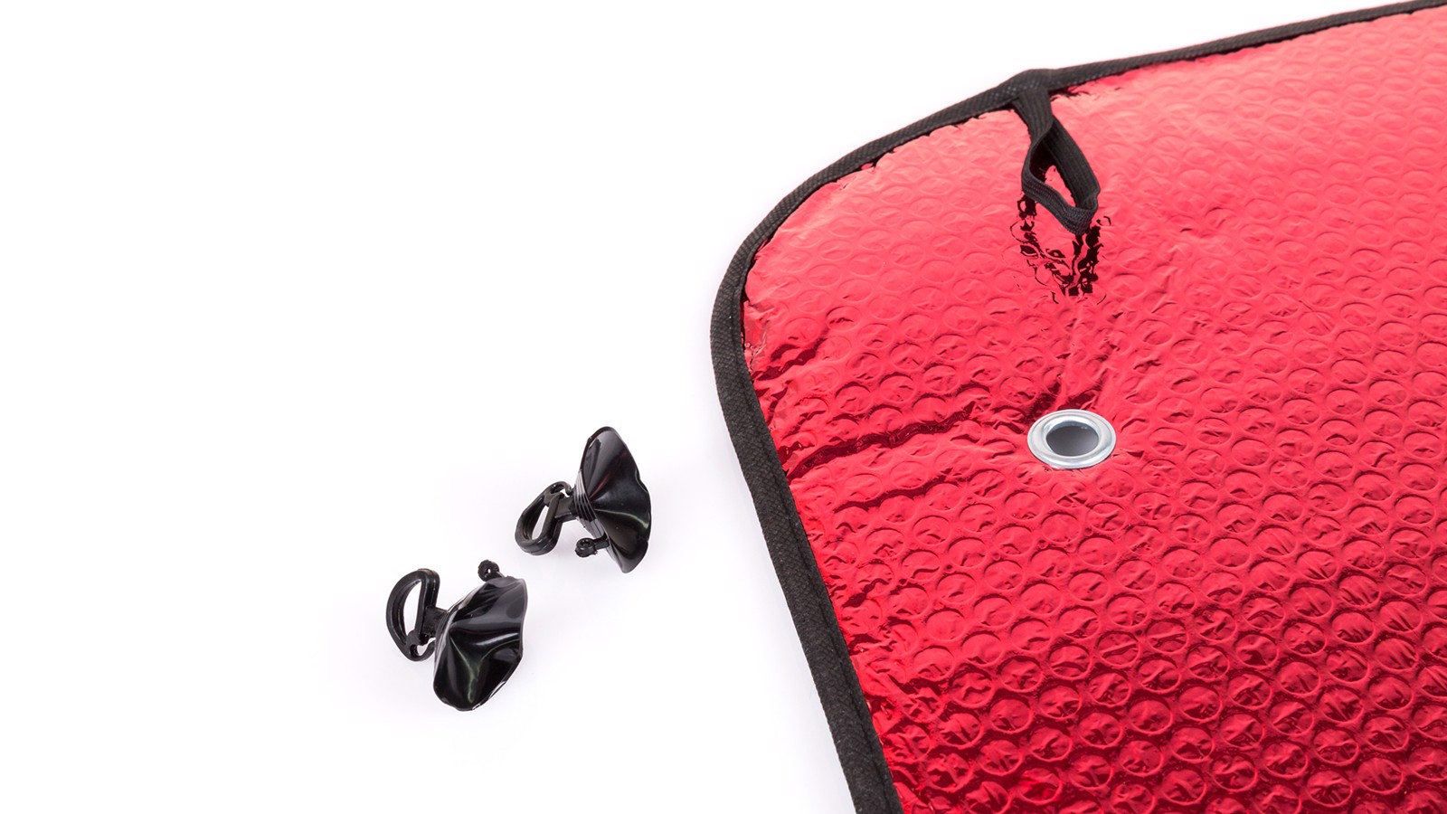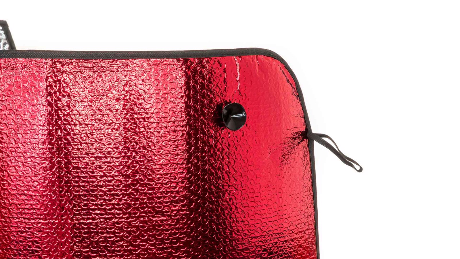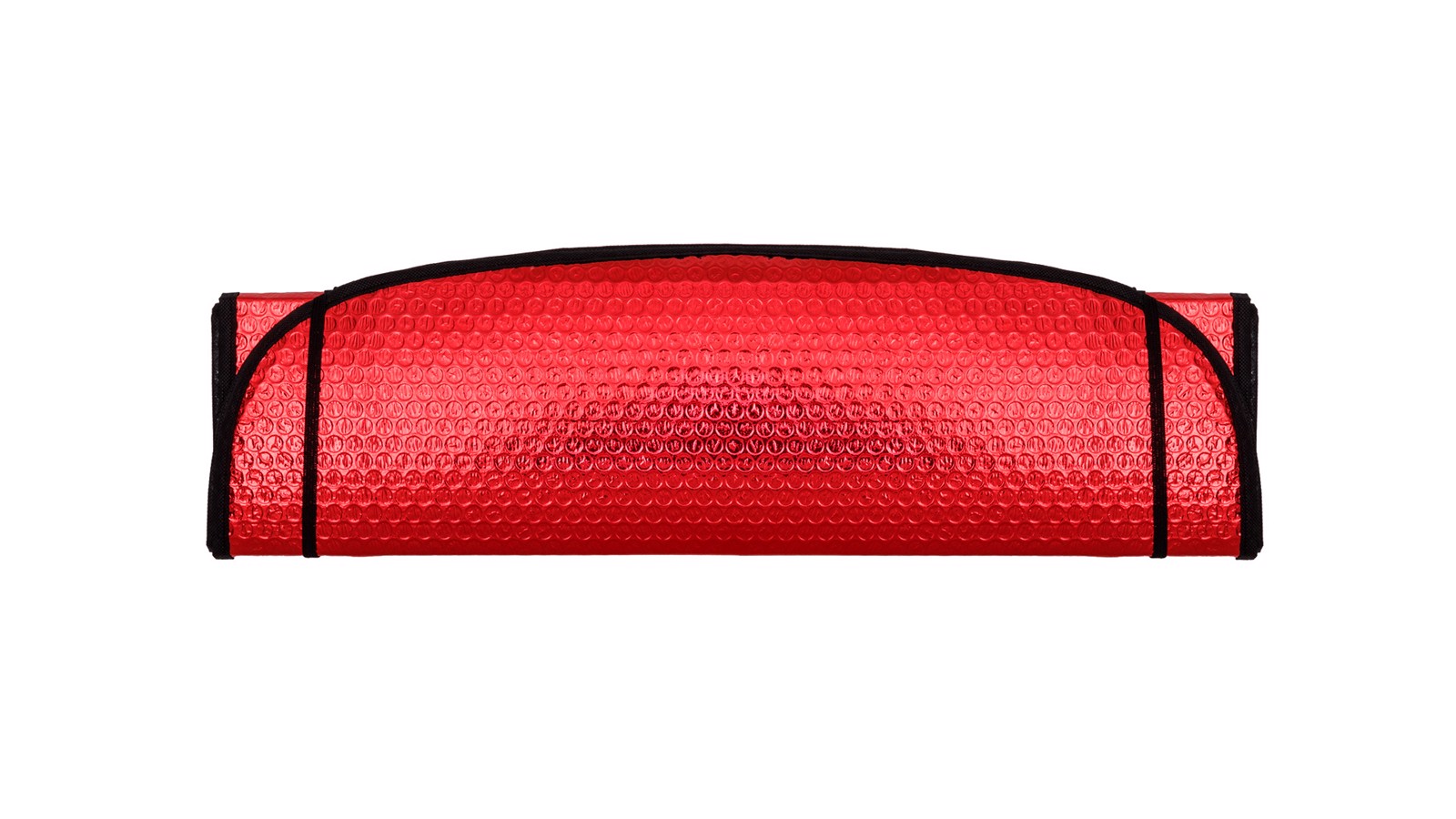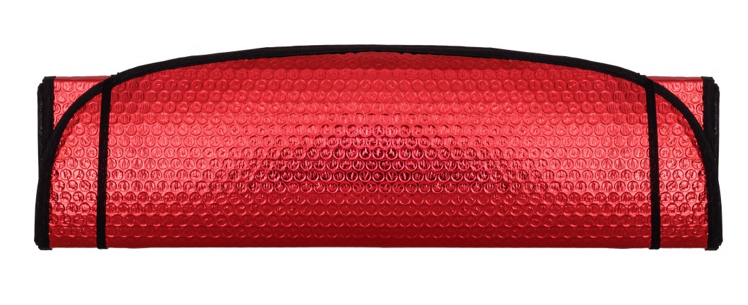 Sunshade in aluminum with bubble on both sides in a varied range of bright metallic colors. Size 130x60cm, with metal reinforcement rings, two suction cups for adjustment and presentation unfolded for easy printing.