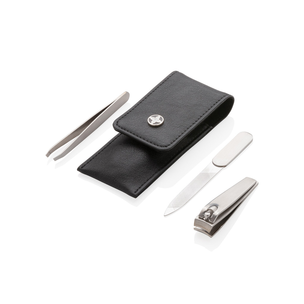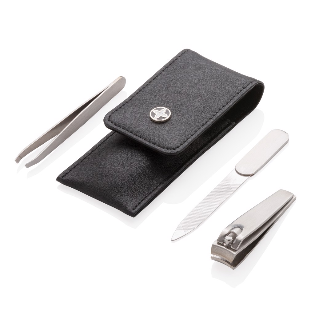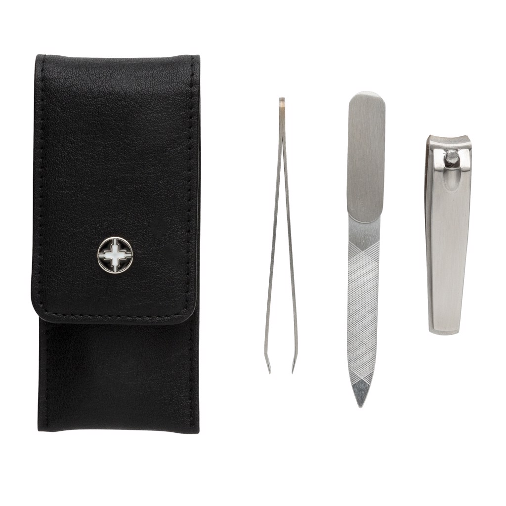 This Swiss Peak 3 piece manicure set is a musthave for good looking nails when travelling. It contains three instruments ideal for nail and other care needs. The set includes a nail clipper and a nail file to effortlessly trim finger and toe nails. The set also includes tweezers. All the instruments are made of matte brushed stainless steel and packed in a beautiful PU case.