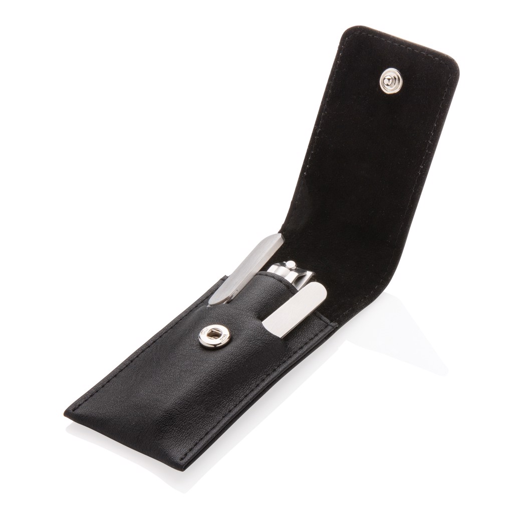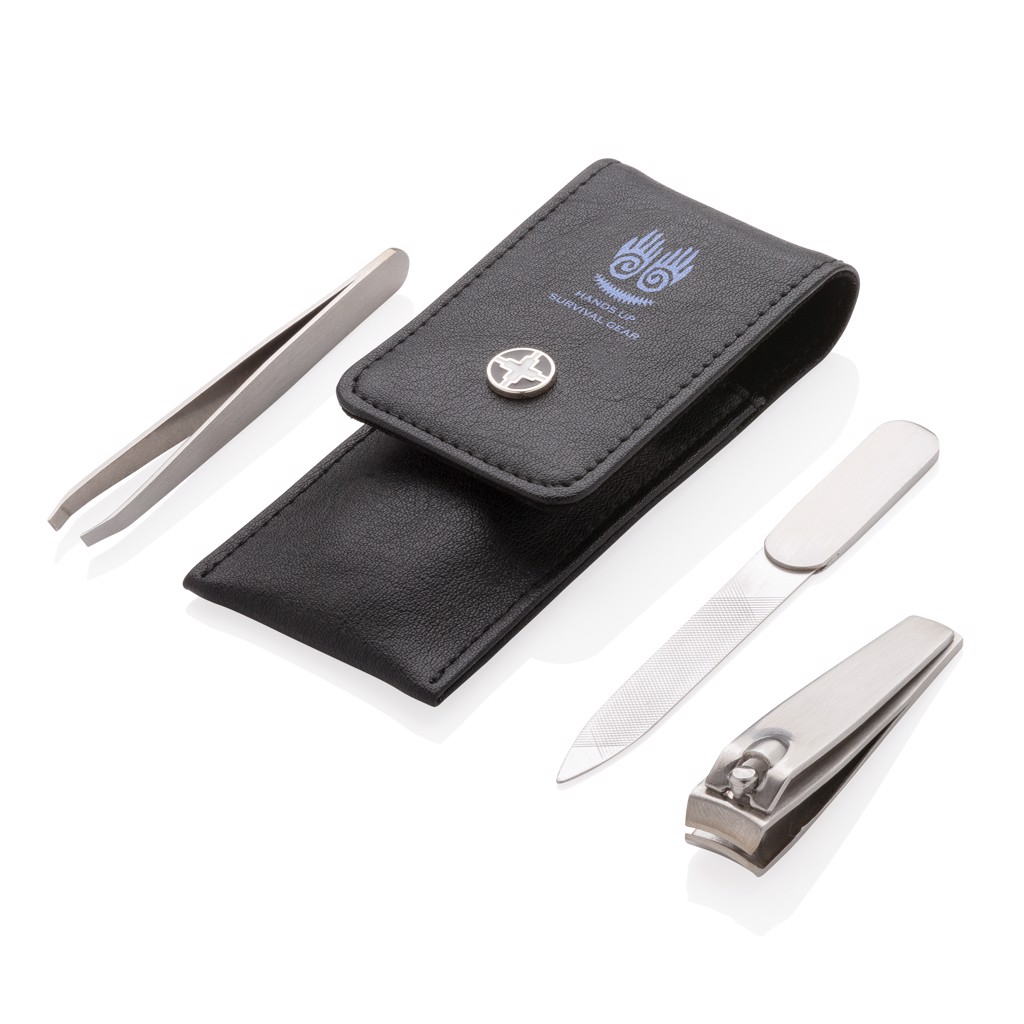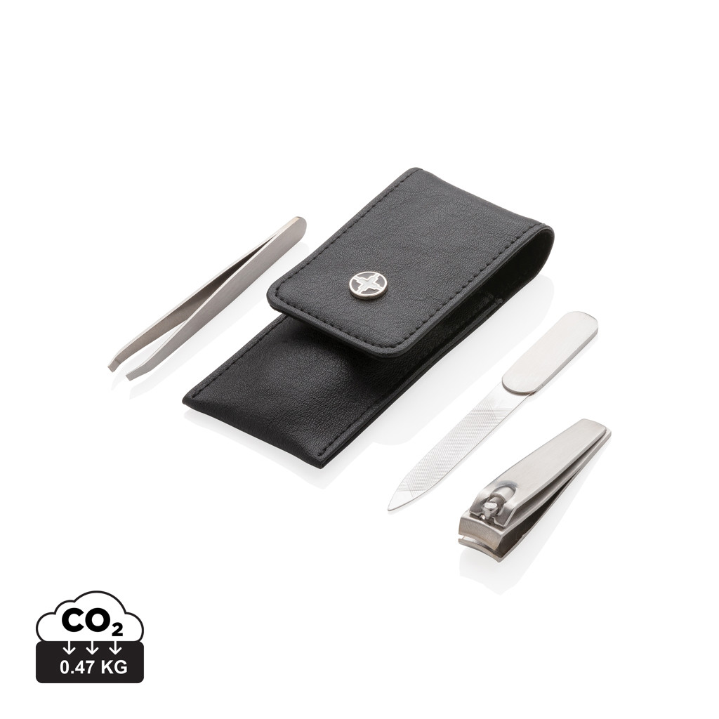 This Swiss Peak 3 piece manicure set is a musthave for good looking nails when travelling. It contains three instruments ideal for nail and other care needs. The set includes a nail clipper and a nail file to effortlessly trim finger and toe nails. The set also includes tweezers. All the instruments are made of matte brushed stainless steel and packed in a beautiful PU case.