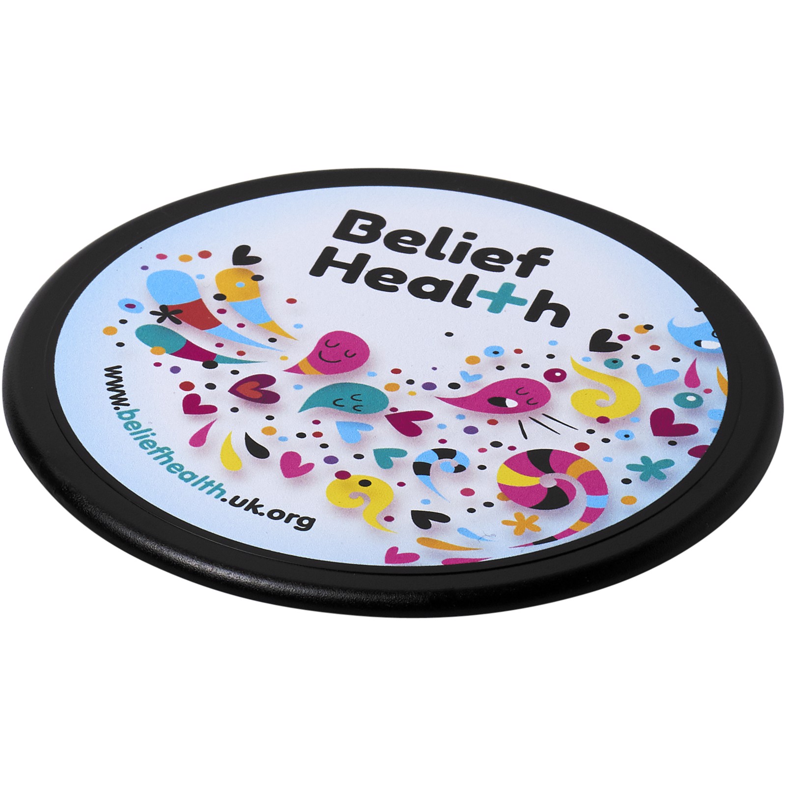 Round coaster that is made from 100% recycled plastic for a fun and eco addition to your customer's desktop.