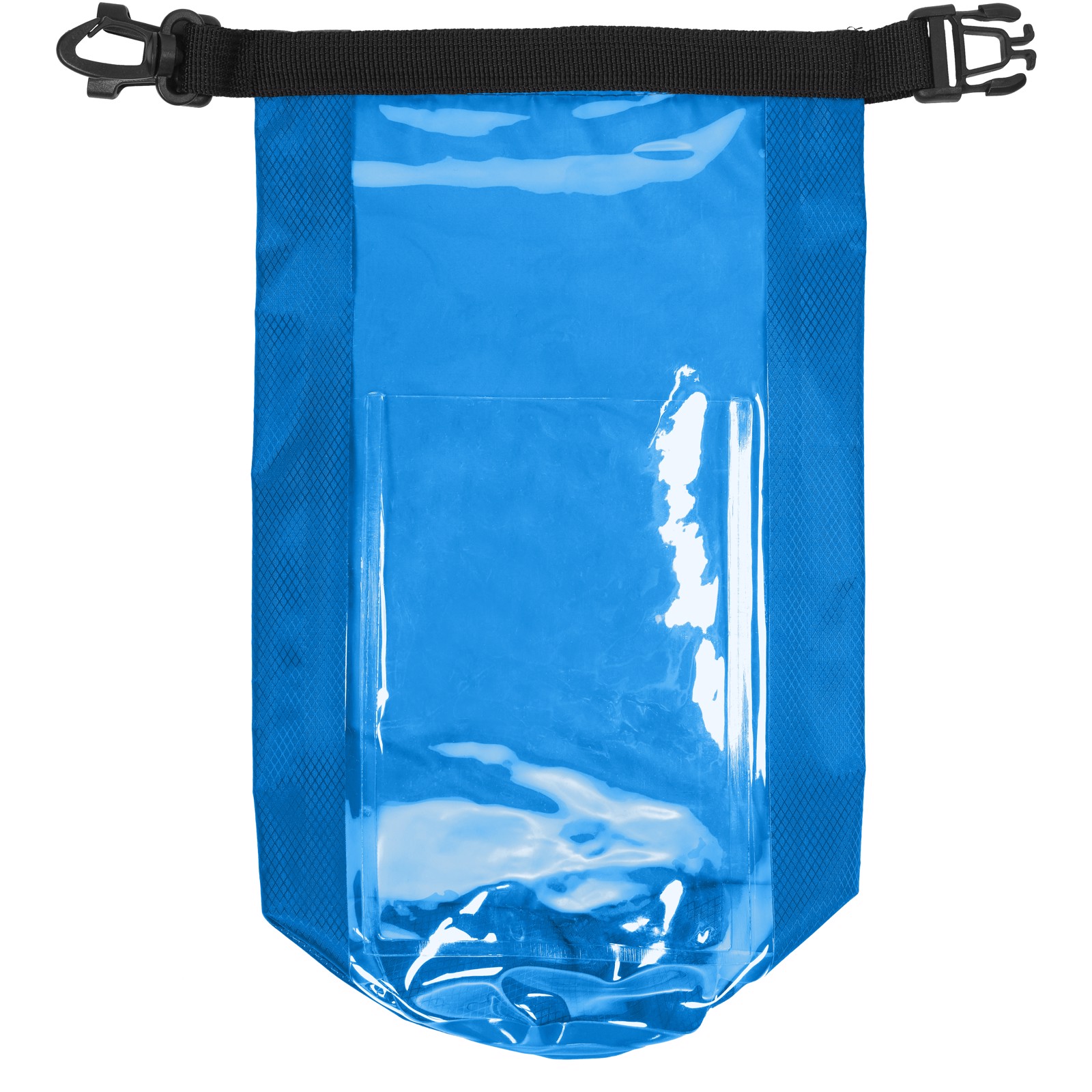 A waterproof bag great for the outdoors. The roll-top closure with plastic buckle ensures valuables are kept dry and safe. The transparent window ensures accessing your device while stored. Can be easily attached to a bag or belt. When rolled down and buckled the content capacity is 2 litres.