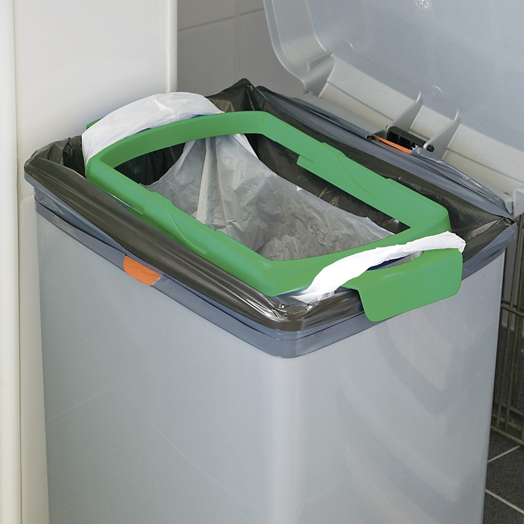 Extensible reusable bag holder suitable for a wide range of bag sizes and garbage bins. Extendable