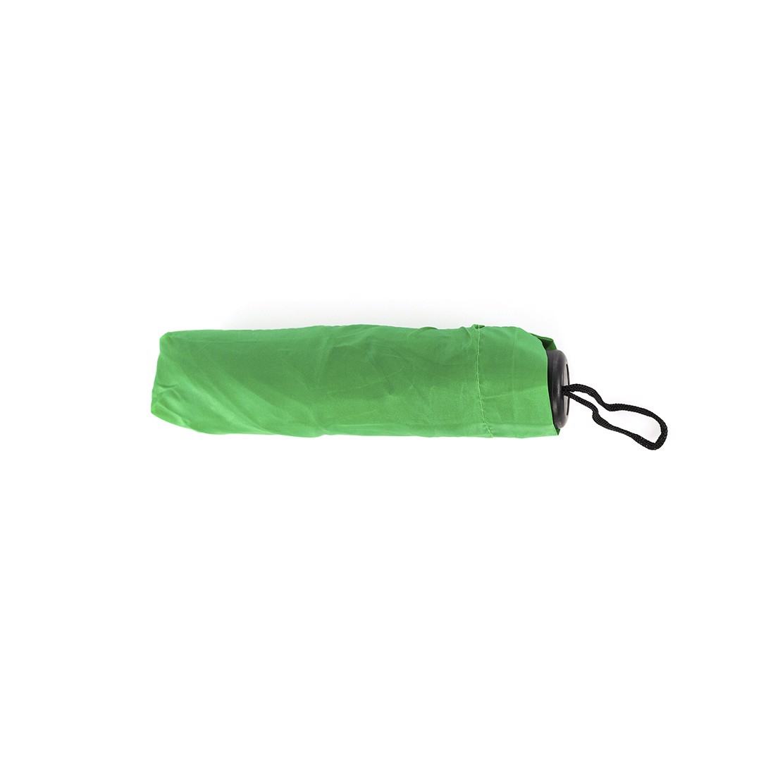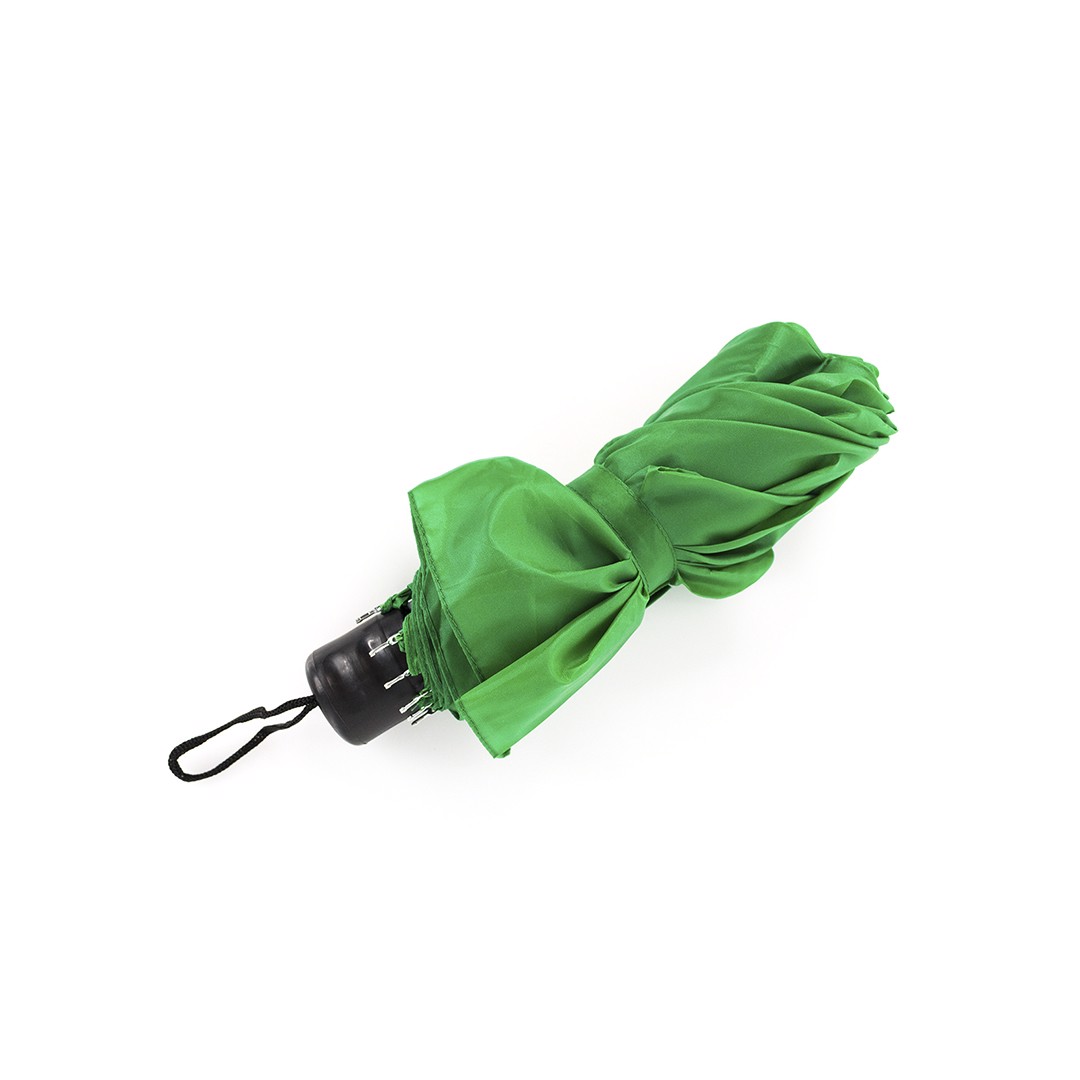 8-panel folding umbrella in a wide range of bright tones. 95cm in diameter, with manual opening and in resistant polyester material. With black metal ribs, velcro closure and ergonomically shaped carrying strap. Presented in a matching color individual case.